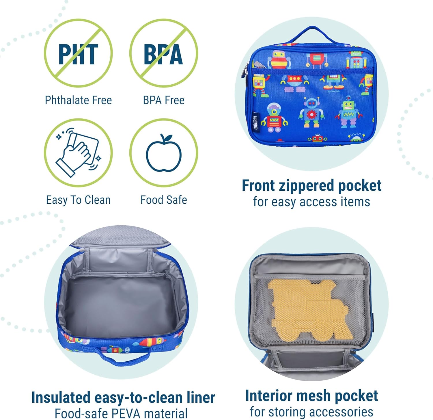 Wildkin Kids Insulated Lunch Box – Durable and Reusable for School & Travel - Robots