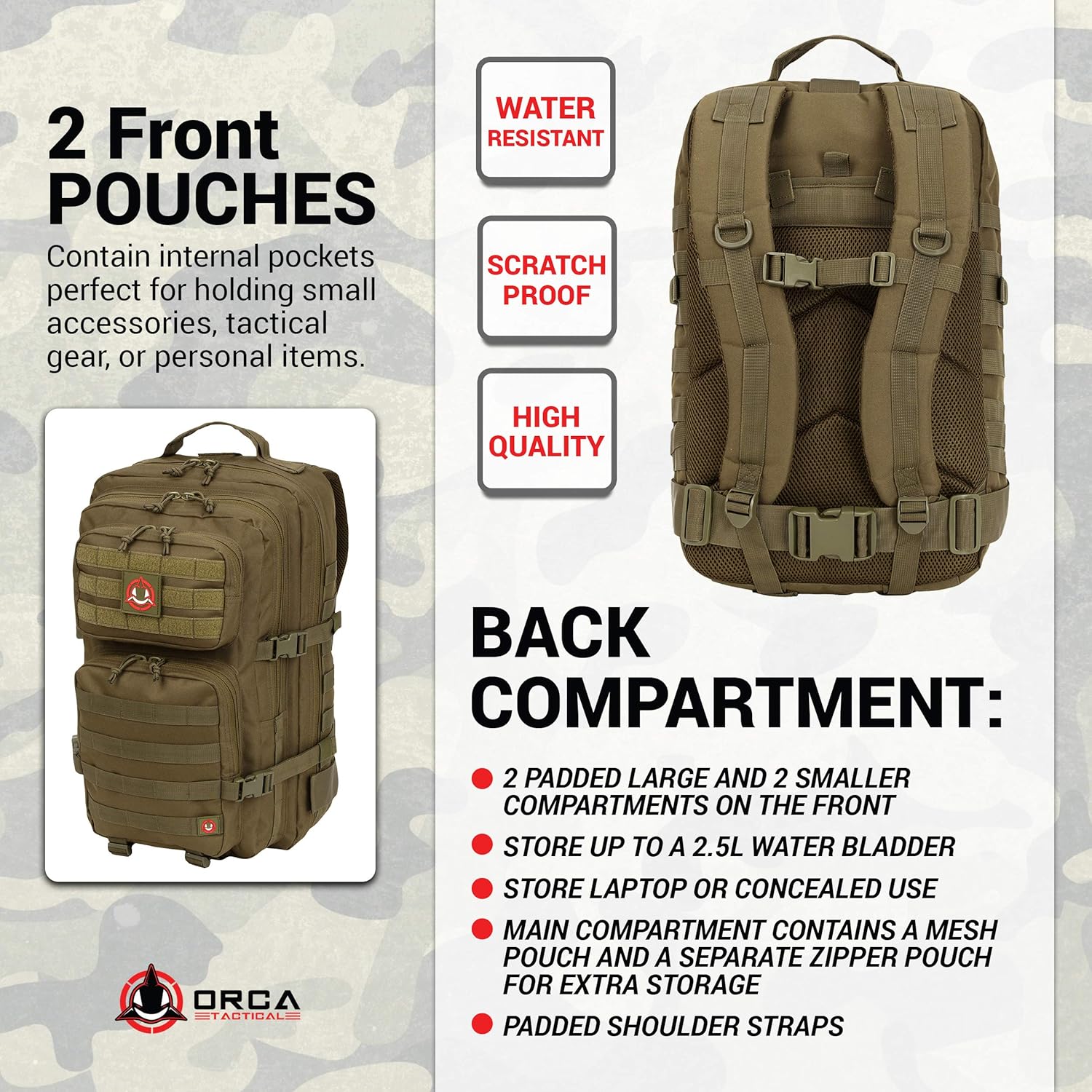 - [BUILT TOUGH]: Made from 600D polyester, this heavy duty backpack for men is reinforced and double-stitched at all stress points. The ORCA army backpack for men features rust-resistant zippers with nylon pulls and a special coating that makes it water-resistant and scratch-proof.