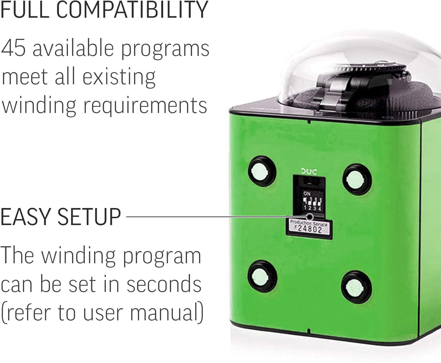 - ⭐ FULL COMPATIBILITY: 45 available winding programs meet all existing winding requirements. You can set the number of Turns-Per-Day from 650 to 3600 TPD.