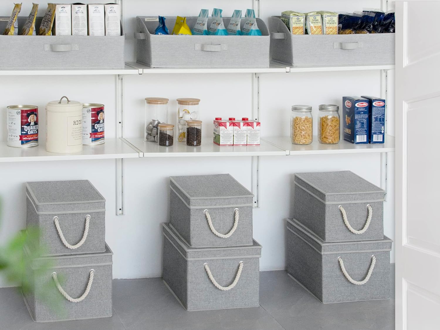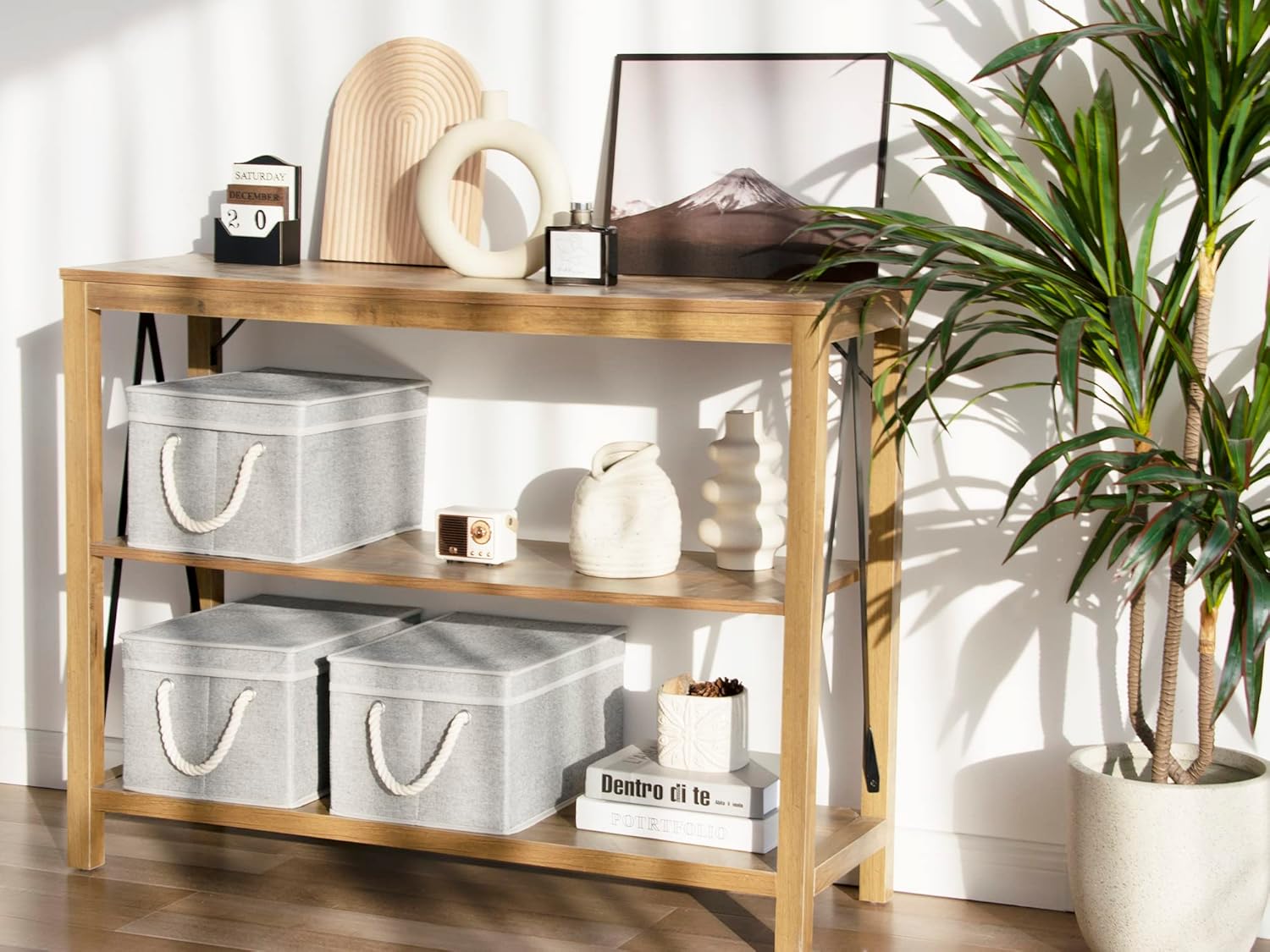 StorageWorks Storage Bins with Lids, Decorative Storage Boxes with Lid and Soft Rope Handles, Foldable Storage Baskets for Closet, Shelves, Stackable, 3-Pack, Gray, Large