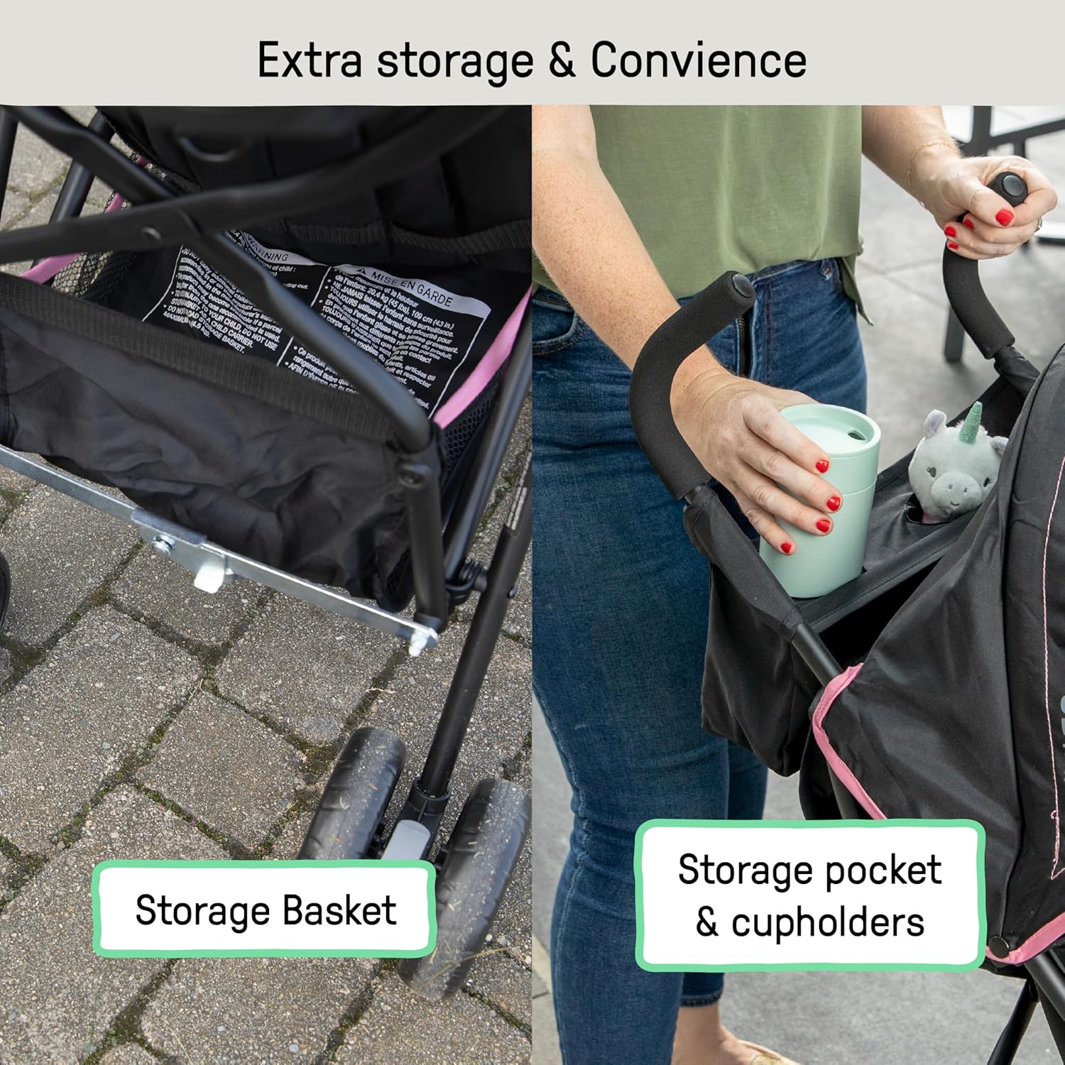 - Includes 2 cup holders, rear storage pocket, cushioned handlebars, and a large, easy-access storage basket so you won't have to leave anything at home