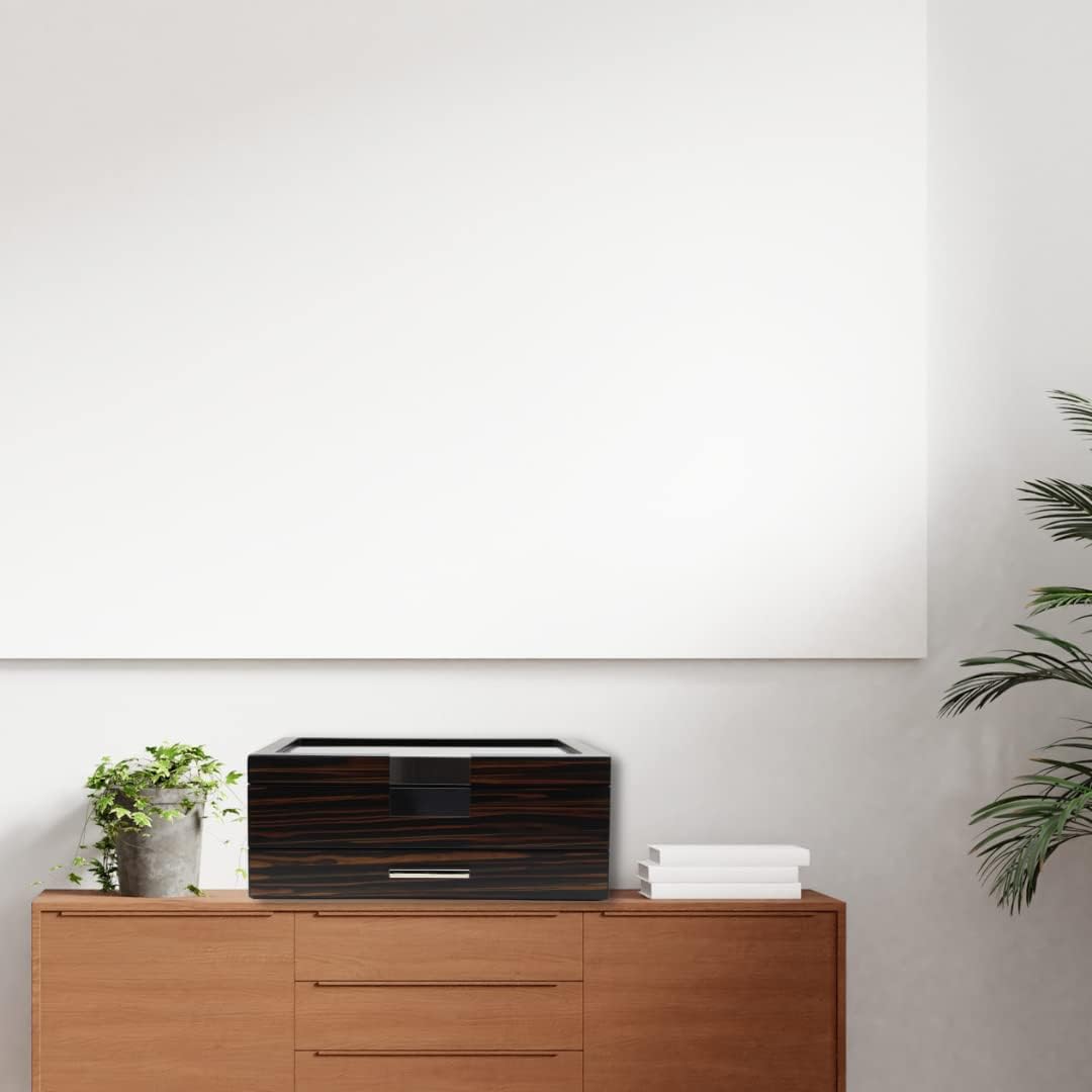 - 6 watch slots, 3 slots for sunglasses, a pull-out drawer with 8 padded rows for cufflinks, rings and more