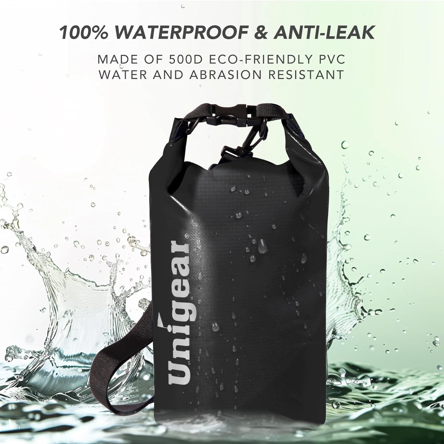 - 100% WATERPROOF: Made of stiff 500D PVC material and designed with roll-top closure, Unigear waterproof bag protects your phones, camera, clothes, documents and snacks from Water, Sand, Dust and Dirt