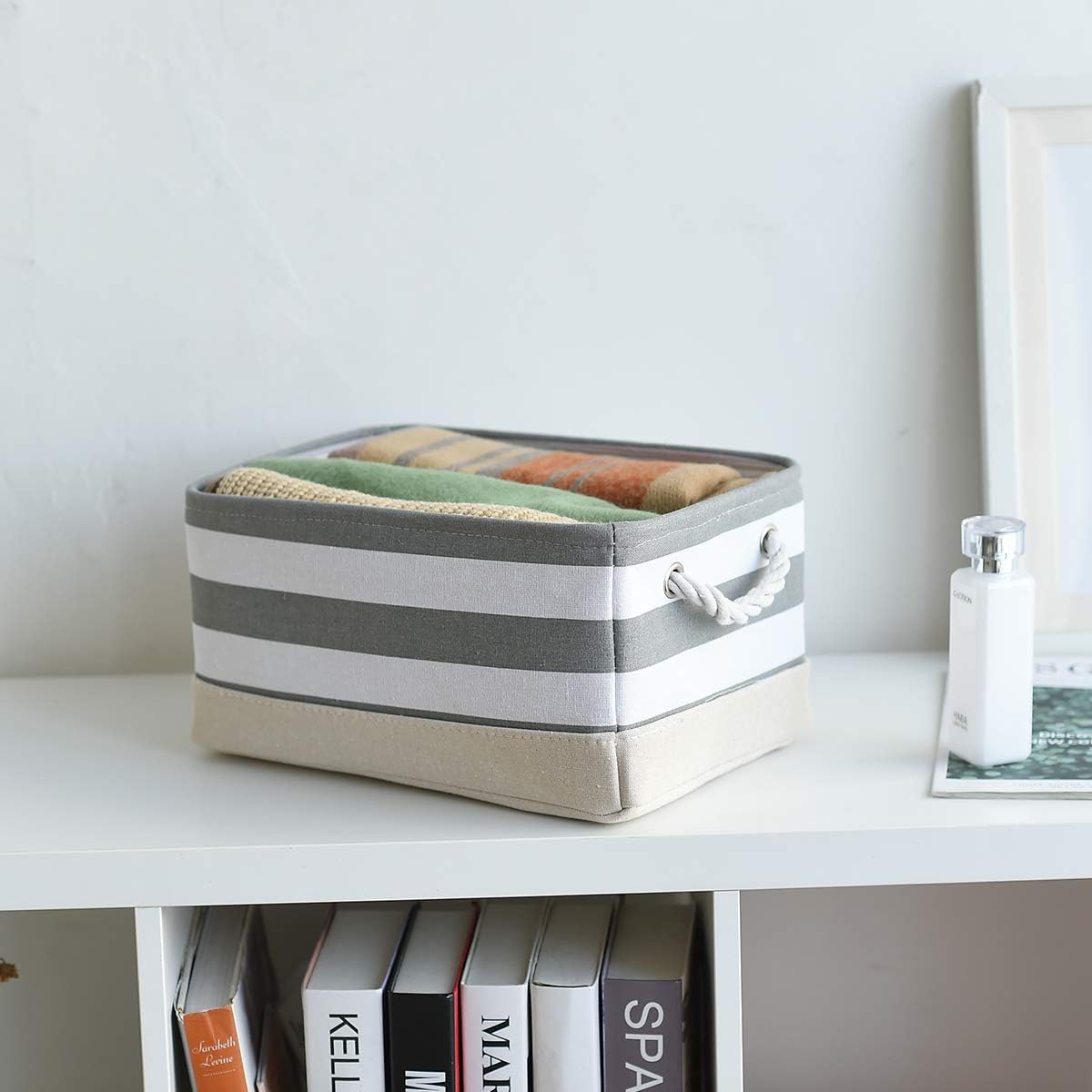 - MULTI-PURPOSE:Great linen basket for books,magazines,toy storage,dog toys basket,shoe basket,clothes basket,shelf,baby bin,pet toy storage,towel basket,blankets,decorations,office supplies,DVD and gifts,Decorative basket ideal for living room,bedroom,bathrooms,utility room,kids room,Nursery Room,craft room,playroom,closet,dorms,condos,laundry room,toilet or even in the hallway.Neutral color can match a lot of home styles- keeping your home nice and tidy