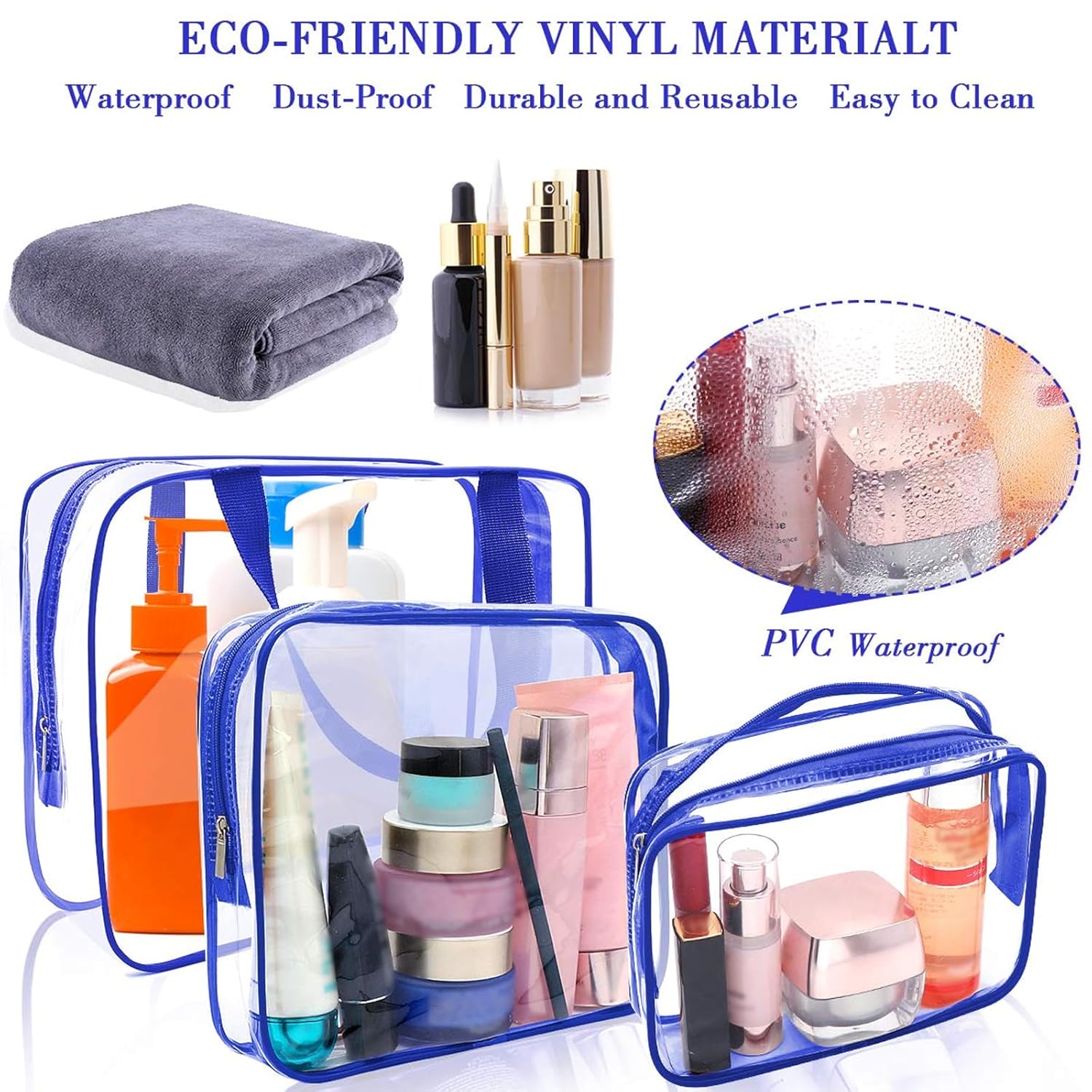 - STAY ORGANIZED: Everything is organized and clear at a glance. Reduce mess with these small to large size transparent zipper bags, suitable for cosmetics; shaving kit; electronic devices; perfume; sunglasses; lipstick; facial cleanser; passport