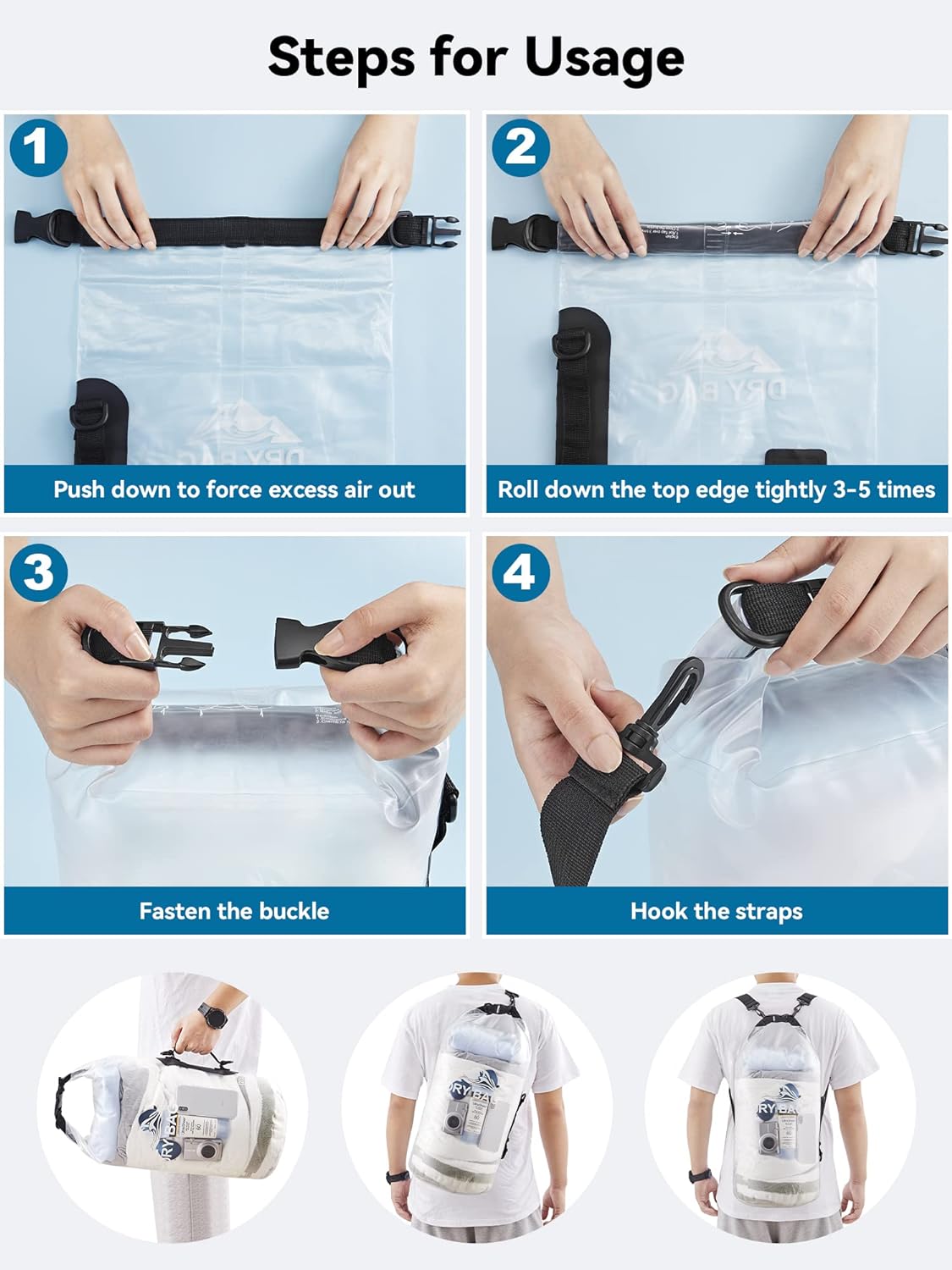 - Durable - Made with wear-resistant PVC material: 0.6 mm thick at the bottom and 0.3 mm on the sides, this waterproof bag is easy to wipe clean and suitable for all kinds of weather and environment. Comfortable to carry during long outdoor activities
