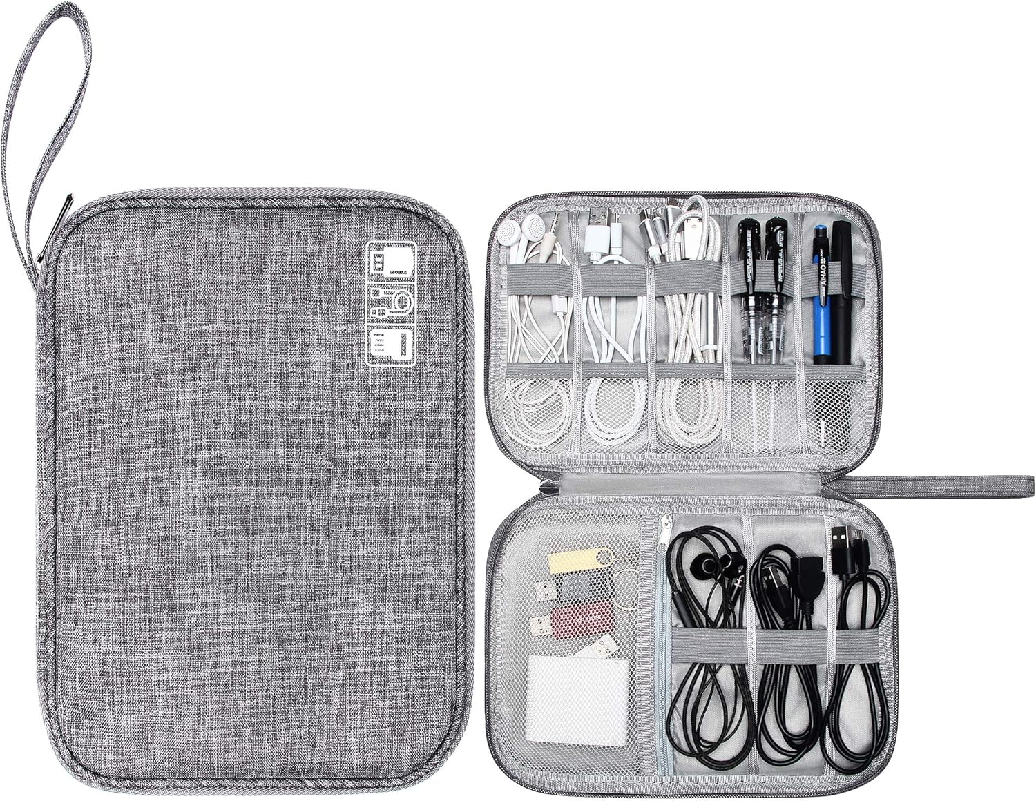 - Compact & Large Capacity -- Size:9.8"L x 7.5"W x 0.8"H. Practical cable organizer bag features 1 inner mesh pocket for power bank, SD cards,batteries,keys, organizer. 5 small mesh segments for USB flash Drivers, earphones, etc. 8 elastic loops can perfectly fit your slender cables, cords, pens and the more. The cable organizer case provides enough room for your essentials.