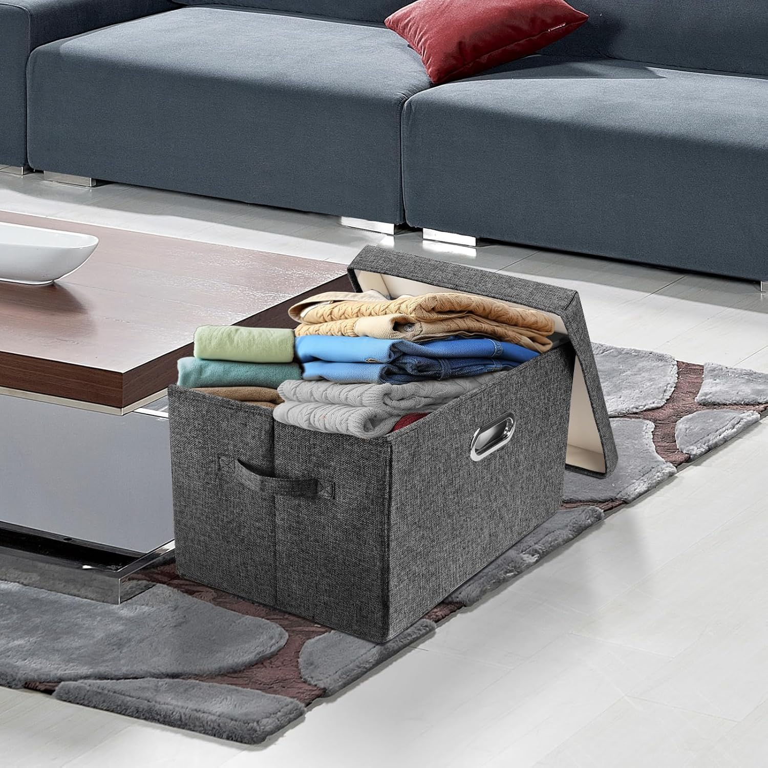 - High-quality fabrics for outer and inner surfaces of storage bins with lids. Compared with the non-woven fabrics used in most storage bins on the market: our collapsible storage bins have no odour, higher strength, and much longer life.