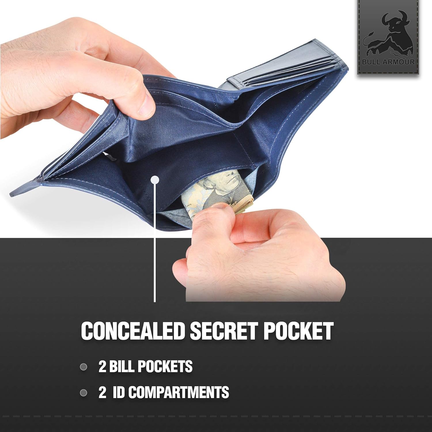 - Smart Design: Our trifold wallet for men features easy to use & carry design with an impressive storage capacity: 1 Id compartment, a divider money section with 2 bill pockets, 2 slip in pockets and slots for 6 cards and 1 secret pocket for discrete hiding. Items and Id cards will be out of the prying eyes but easily accessible when needed. Crafted for efficiency and high capacity, you'll never want to use another wallet or money clip again