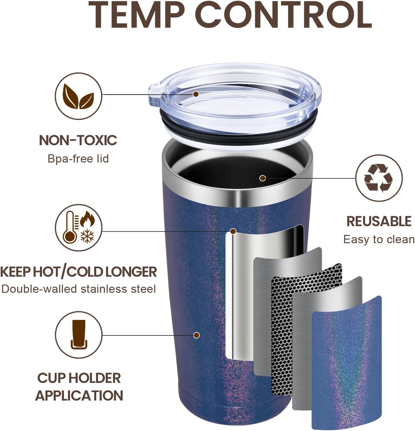 - DURABILITY- 18/8 food grade stainless steel body, No BPA, healthier than plastic cup. The insulated tumbler never sweat due to the Vacuum insulated design. Powder coating on the outside fits more comfortably in your hand, looks good, anti-slip