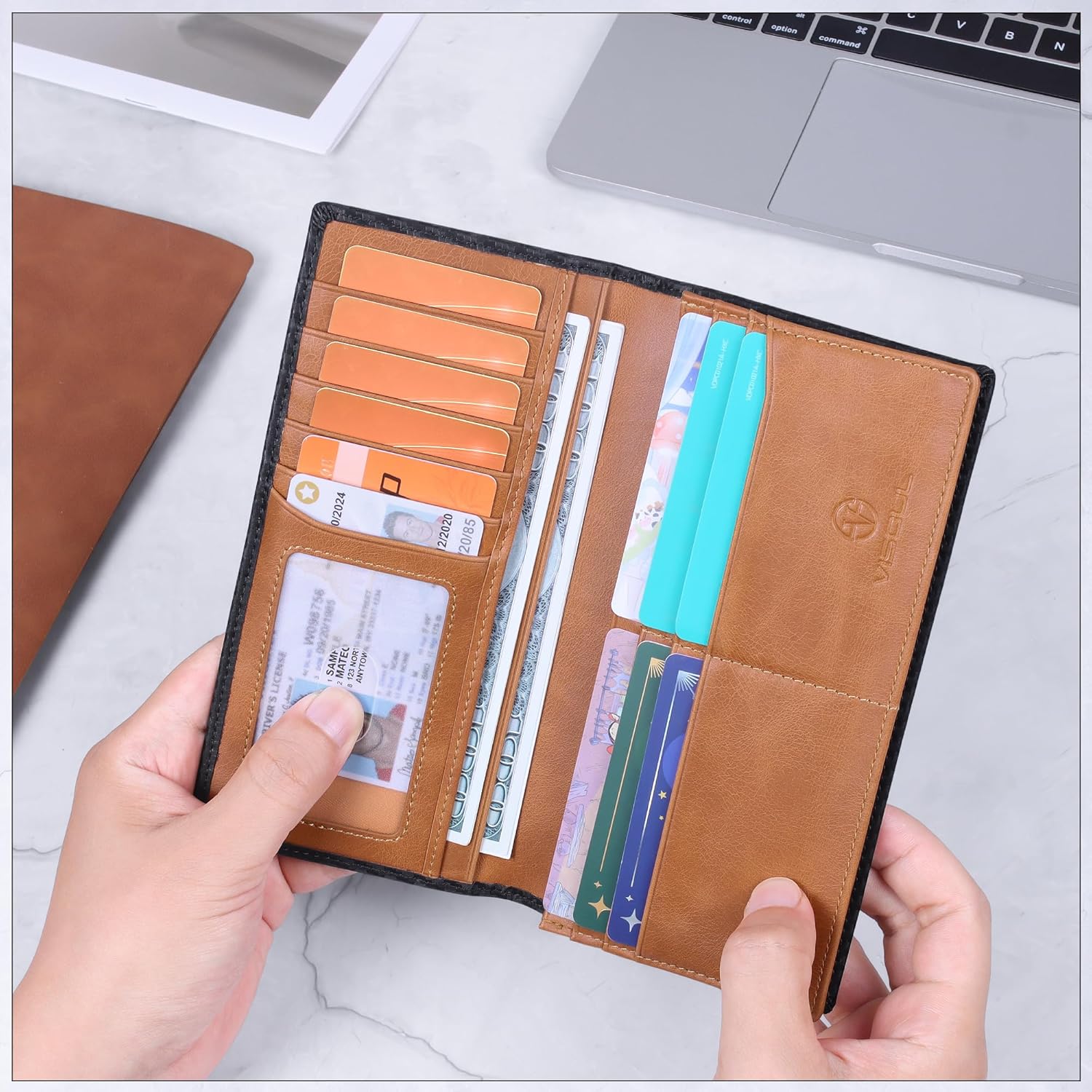 - Cash and Credit Card Holder: Designed for men; Long breast wallets for your suit; Size: 7.4“L ×0.7”H; 11 slots for credit cards, 1 view pocket for your drive licence, 3 money or check slots; You can get an organizer with many pockets and all your items have their place; Pay attention, this checkbook wallet is too narrow or small for your phone