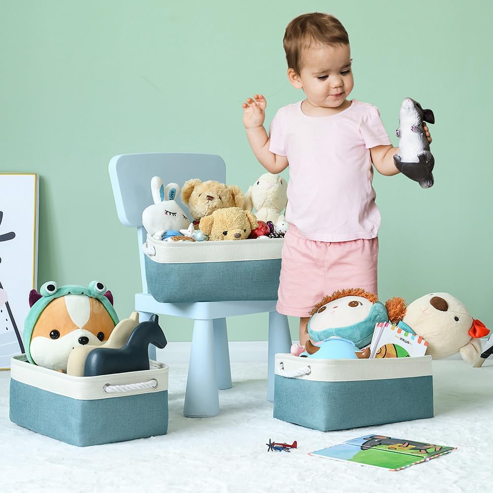 TheWarmHome Fabric Storage Bins Baskets for Organizing,Sturdy Storage Basket W/Handles, Decorative Foldable Storage Baskets for Shelves Closet Nursery Toy (White&Teal, Medium - 3 Pack)