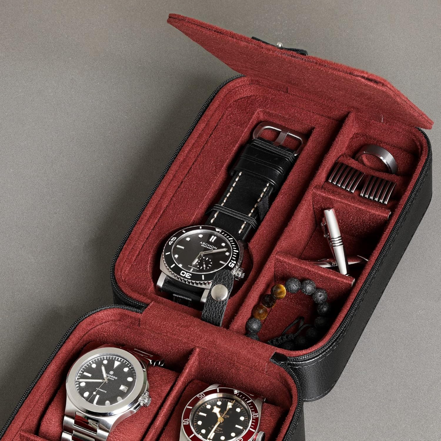 ROTHWELL 5 Watch Travel Case Storage Organizer for 5 Watches | Tough Portable Protection w/Zipper Fits All Wristwatches & Smart Watches Up to 50mm (Black/Red)