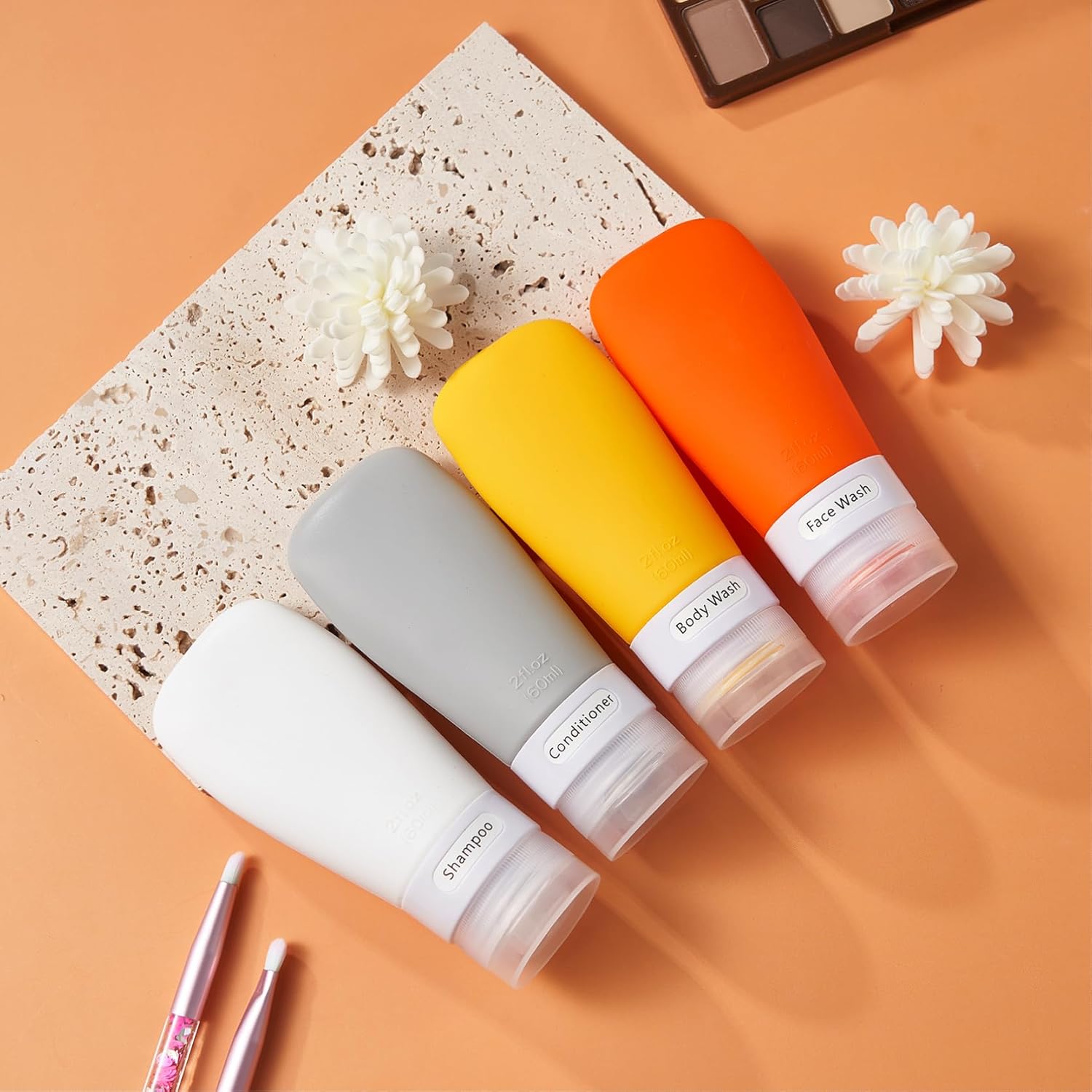 - TSA Carry on Approved: 4 pack 2 ounce silicone travel bottles, perfect for shampoo, conditioner, body wash, lotion, hand sanitizer, shower gel. Packed with a high quality zippered clear toiletry bag, saving space, easy to carry with for travels or gym workout.