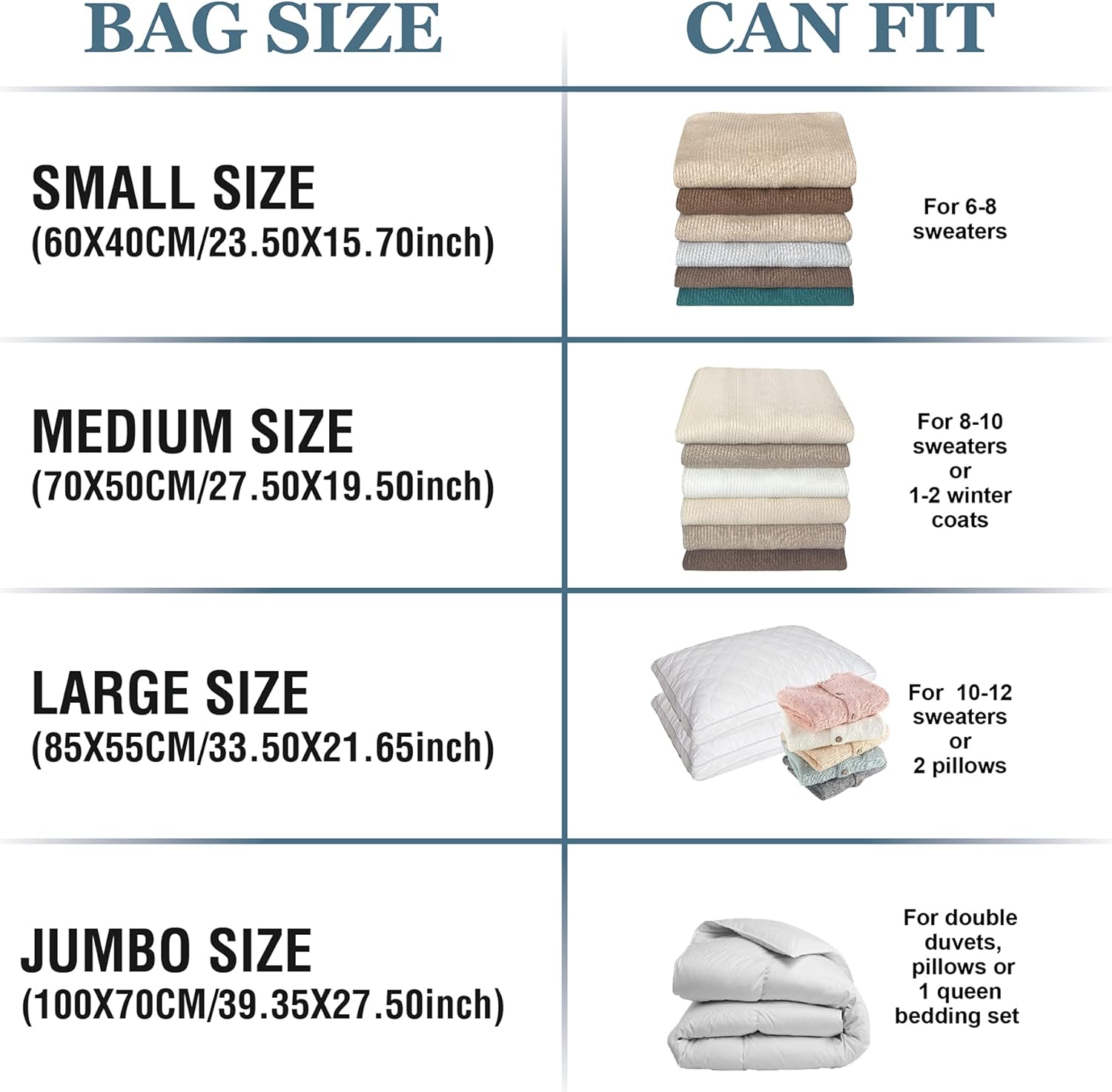 - Variety Vacuum Storage Bags: Our combo includes 10 vacuum compression bags (5 jumbo and 5 large bags). Reduce original volume by 80%. A must-have for home organization, moving, and travel. Store your clothes, bed sheets, blankets, and many more!