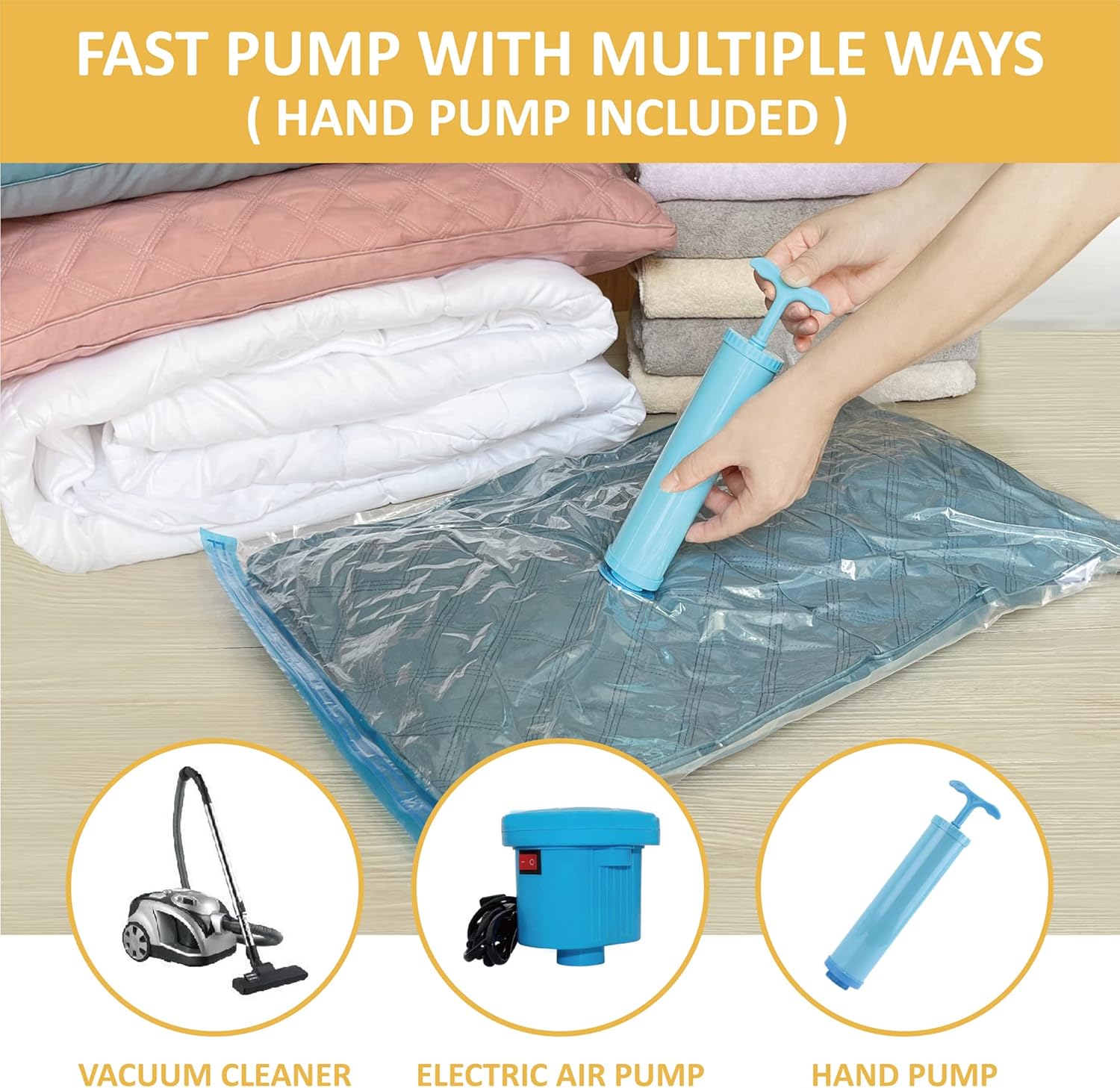 - Package Details: 10 Medium bags (70 X 50 cm). Portable hand pump is included in the package. Our vacuum compression storage bags work with any vacuum cleaner. Use our bags at home or on the go.