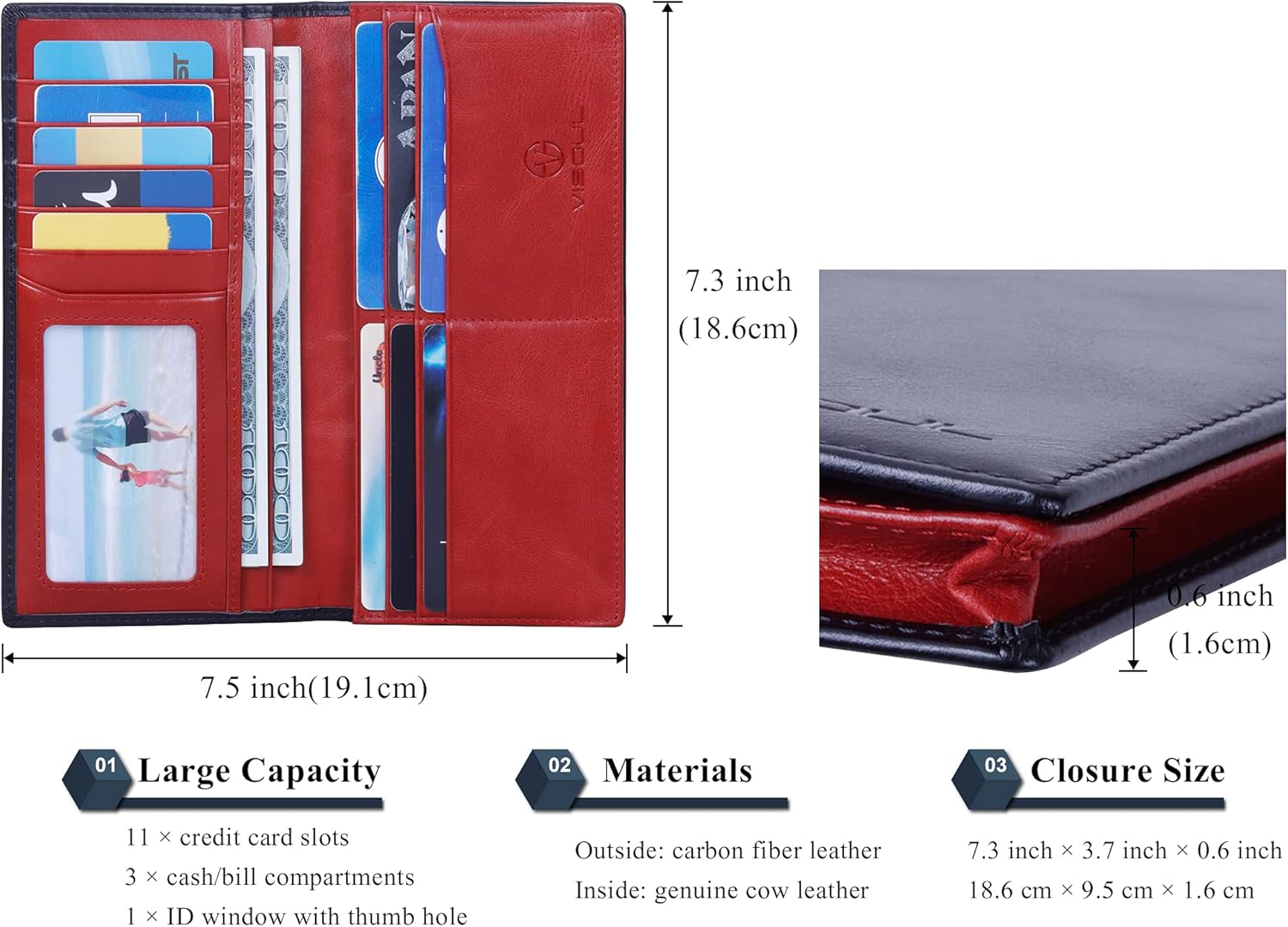 - Cash and Credit Card Holder: Designed for men; Long breast wallets for your suit; Size: 7.4“L ×0.7”H; 11 slots for credit cards, 1 view pocket for your drive licence, 3 money or check slots; You can get an organizer with many pockets and all your items have their place; Pay attention, this checkbook wallet is too narrow or small for your phone