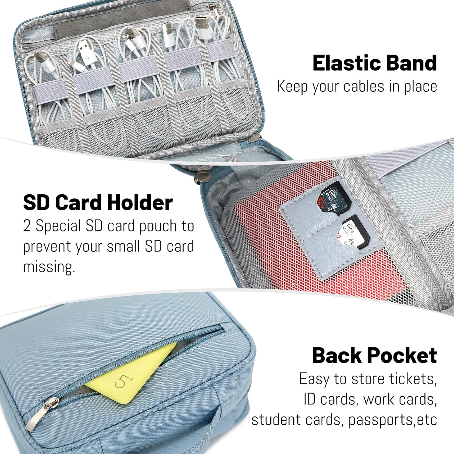 - 【DOUBLE LAYERS & WELL ORGANIZED】This travel electronics organizer is designed with multiple pockets and various size of elastic bands providing great flexibility for organizing electronics accessories such as USB Cable Cord, Flash Drive, Wall Charger, TF/SD Card, Hard Drive, Power Bank, Earbuds, Camera.2 large zipper mesh pockets,1 Small zipper mesh pockets,2 SD Card holder,1 Back Zipper Pocket.