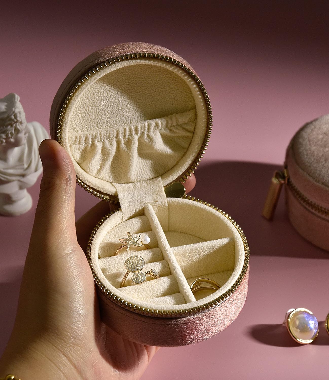 TAIMY Travel Jewelry Box, Mini Round Velvet Travel Jewelry Case for Women Girls, Portable Small Jewelry Travel Organizer Boxes for Rings Earrings Necklaces Bracelets(Blush Peach)