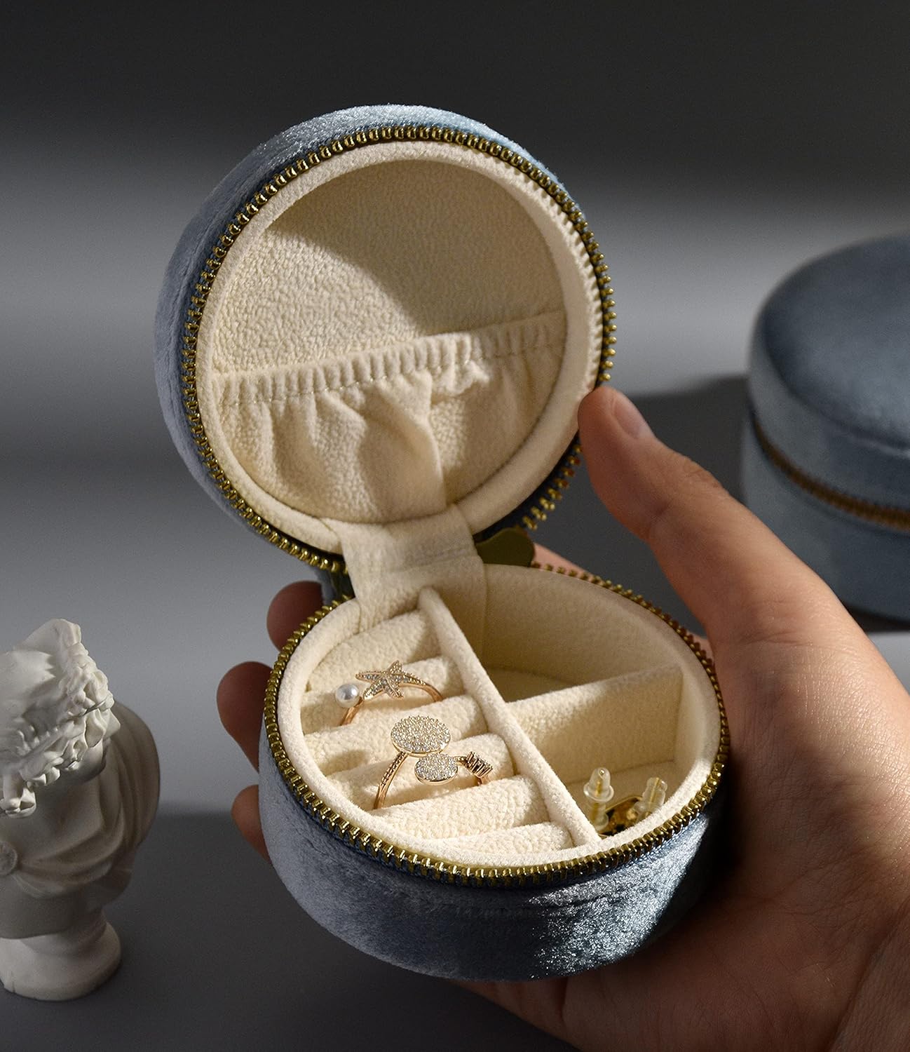 TAIMY Plush Velvet Travel Jewelry Box, Round Mini Travel Jewelry Case for Women Girls, Portable Mini Jewelry Travel Organizer Boxes for Rings Earrings Necklaces Bracelets(Ocean Blue)