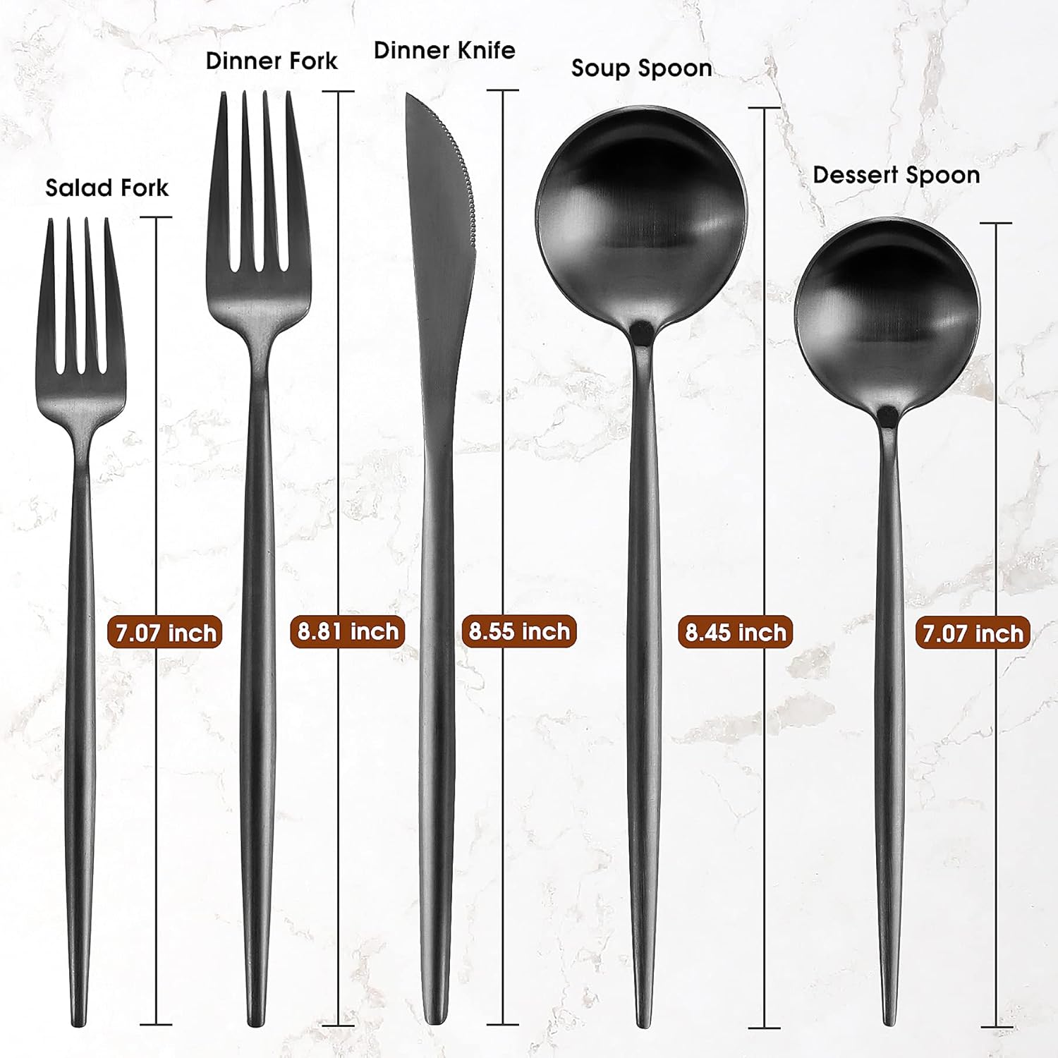 - Black cutlery set have the unique, stylish looking make it extremely gorgeous in appearance, standing out from ordinary tableware, stainless steel utensils set goes well with any style you already have. Spoons and forks set can match your modern dinnerware set and dish set perfectly, is ideal for family, hotel, kitchen.