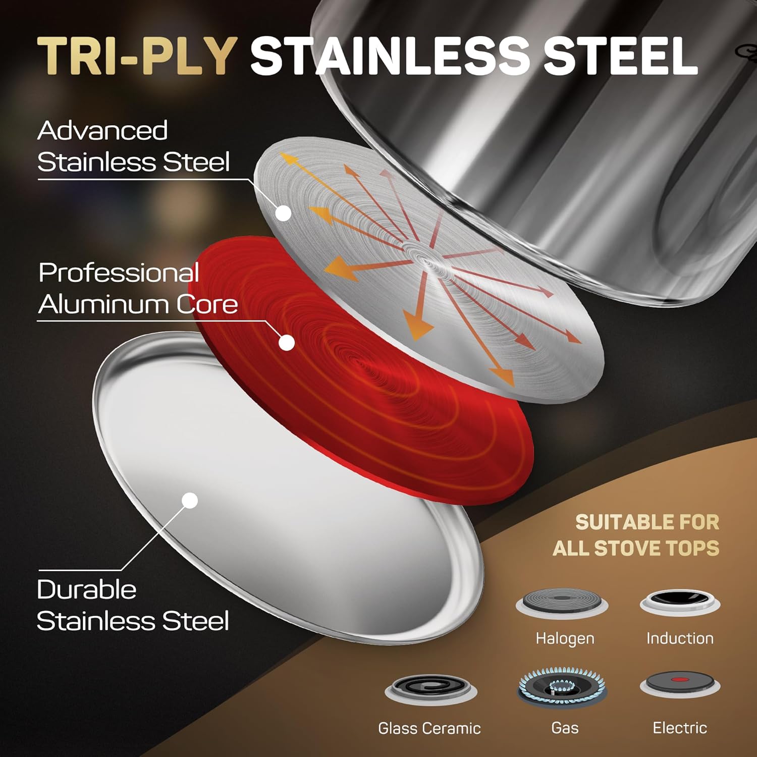 - 【Strong and Durable, Impact-bonded 3-Ply Base】 The pots and pans feature a 3-ply premium quality 18/10 stainless steel base includes a thick aluminum core that provides the unsurpassed quickly heat conductivity, insures maximum heat retention and even heat distribution, saves engery and time for cooking!