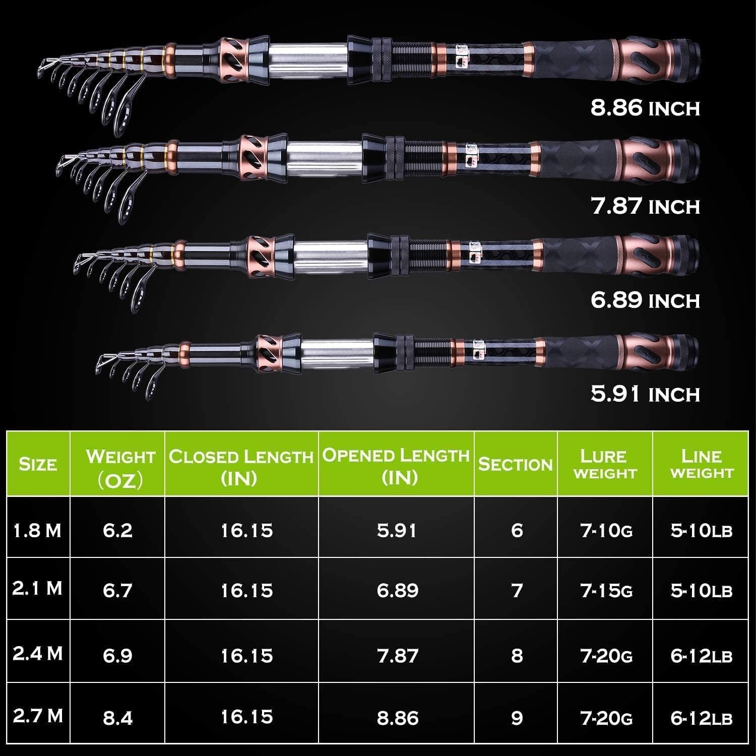 - 🎣 PLUSINNO telescopic fishing rod are constructed with High Density 24-Ton Carbon Fiber reinforced with Fiberglass Composite for power and elasticity.