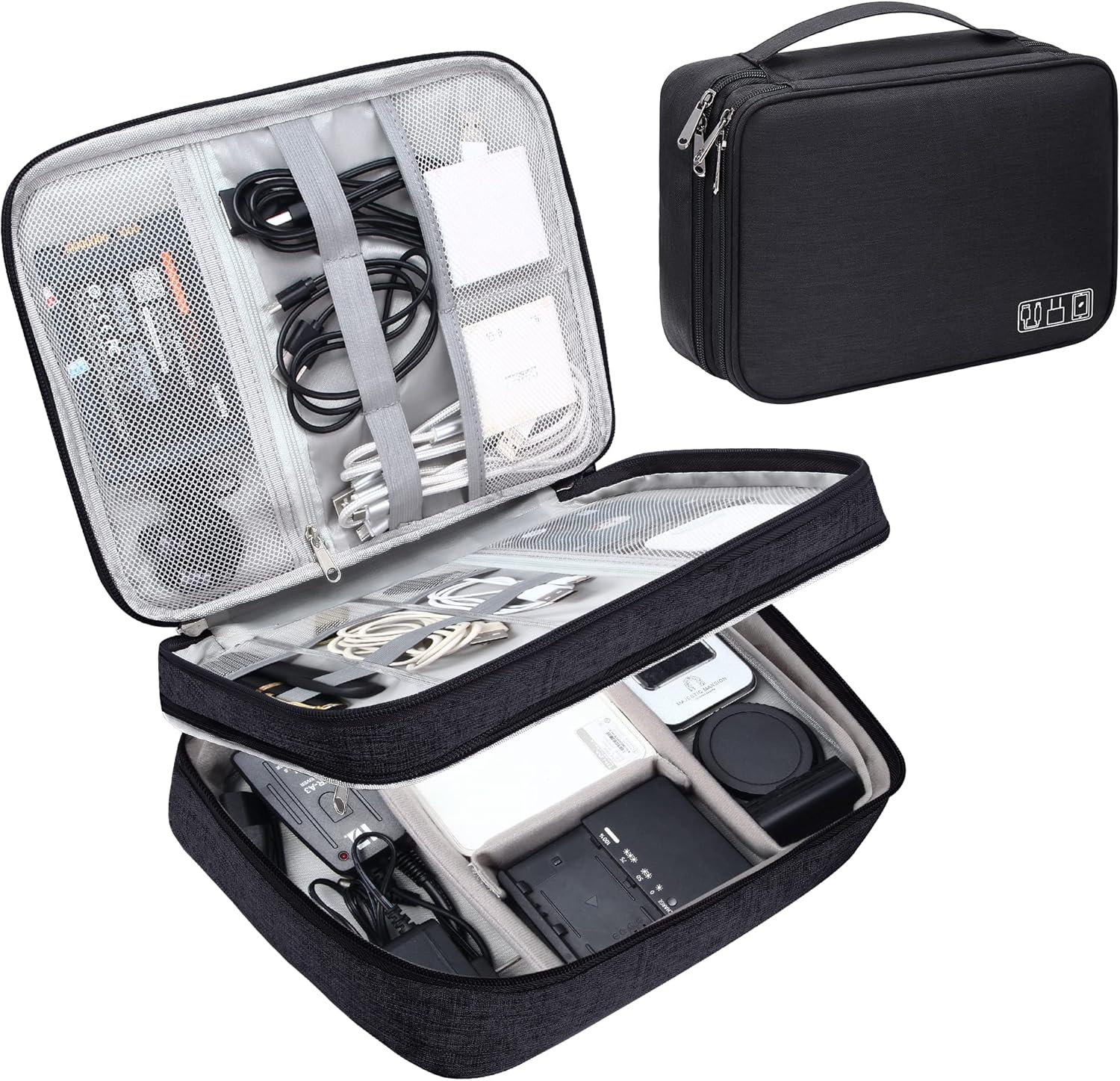 - 【DOUBLE LAYERS TECH ORGANIZER】- The cord organizer case is designed with 2 layers. The first layer to organize small electronic accessories like cords, cables, USB, chargers, earphones. The second layer to organize larger electronics accessories like tablet, power bank, adapters, hard drive, cellphone, mouse.