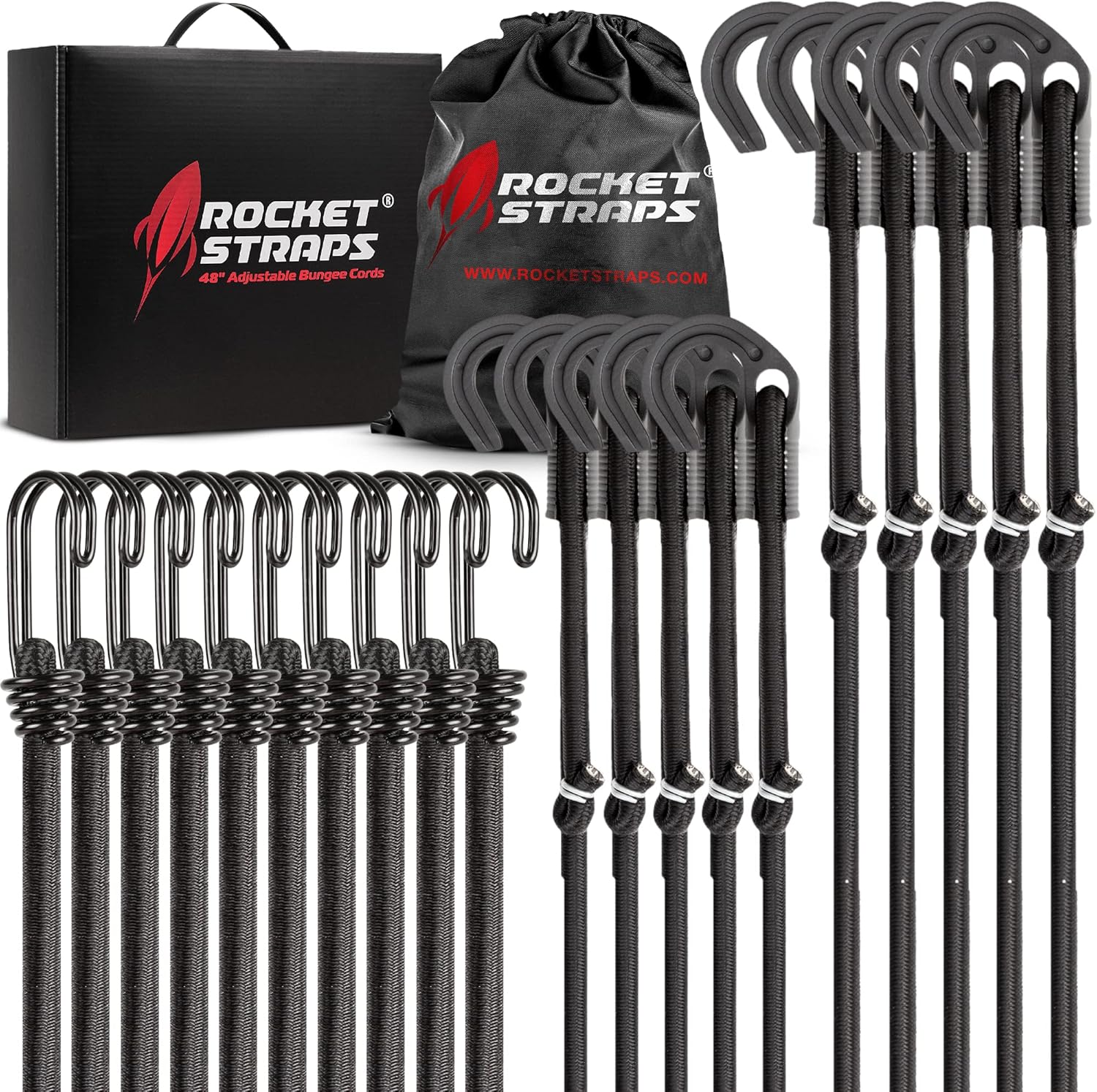 - 8.) Rocket Straps bungee options: But it's not just the quality of our bungee cords that sets us apart from the competition. We also offer a wide range of sizes and styles to meet the needs of our customers, whether they need bungee cords for securing loads on a truck or for recreational use. 12 piece 32 inches, 12 piece 48 inches, 12 piece 72 inches, 28 piece Flat, 24 piece carabiner, 36 piece Double J Hook, 36 piece plastic hook. Visit our Amazon store to view our other bungee sets.
