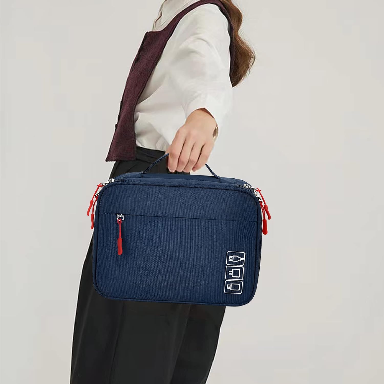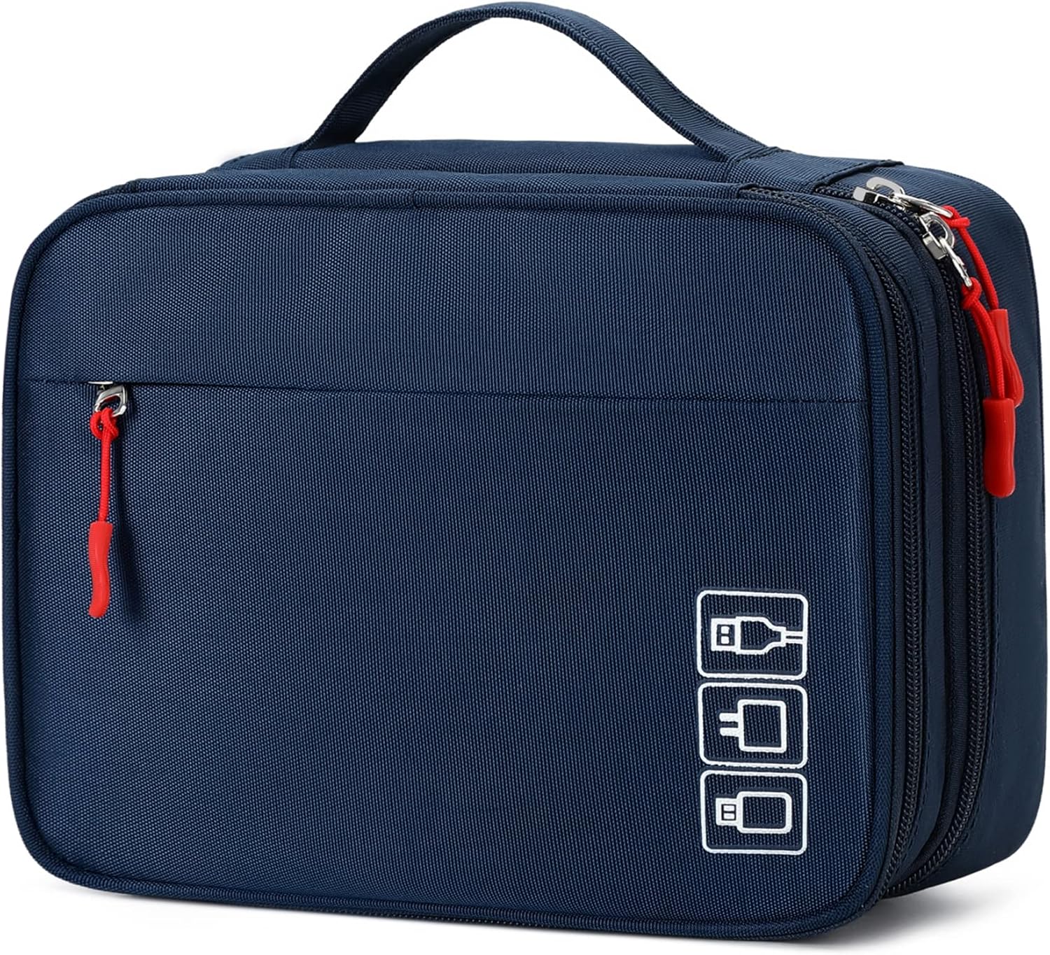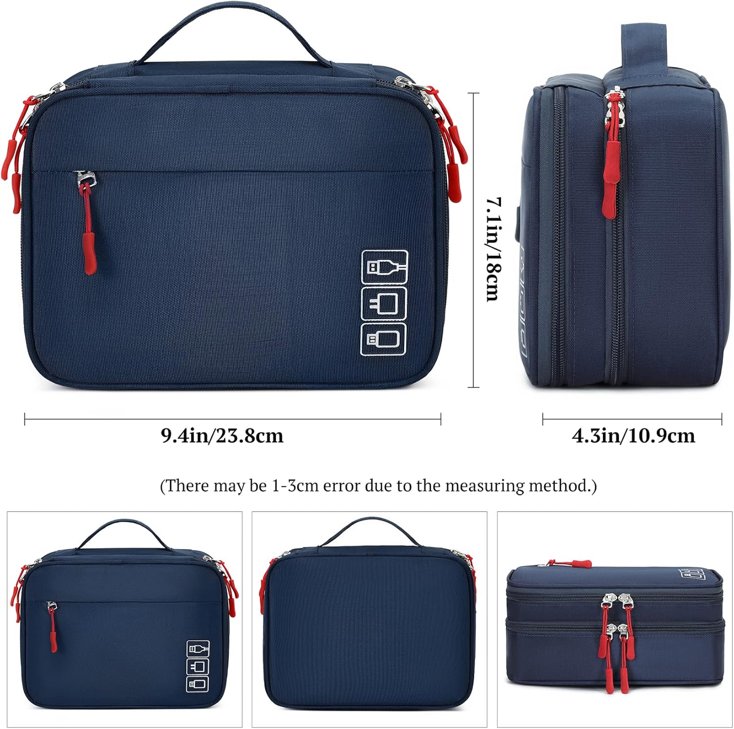 - Large Capacity: L9.4*W7.1*H4.3 inches (24*18*11 CM). Double layers design has enough space to store your chargers, cables, adapters, power bank, earphones, sd card, mouse, wireless charging-pads, cords, smartwatch and any small electronic accessiories.