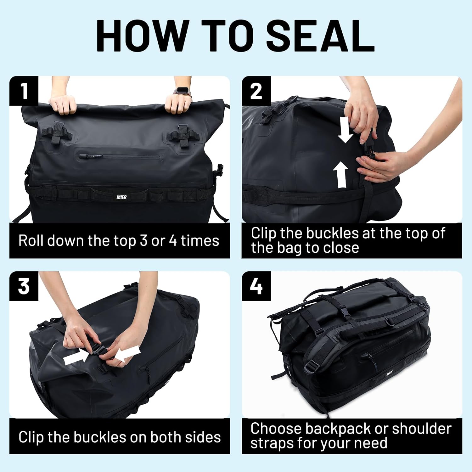 • 100% Waterproof & Sandproof --- MIER dry duffle backpack is made of abrasion-resistant, water-repellent tarpaulin and has fully welded seams for absolute protection. Its wide hook-and-loop-secured roll-top opening enables quick access. To seal: simply fold the top down 3 times and secure with side clips for a snug, compressed, weatherproof fit