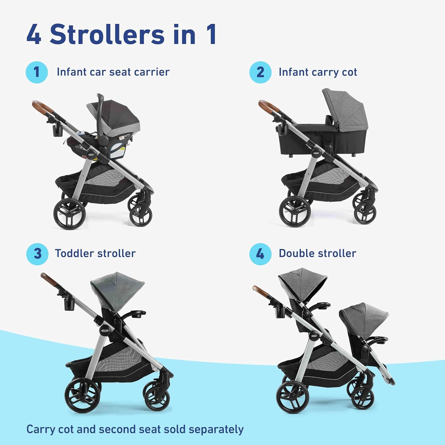 - 4 Strollers in 1: Infant car seat carrier, infant carry cot, toddler stroller, double stroller