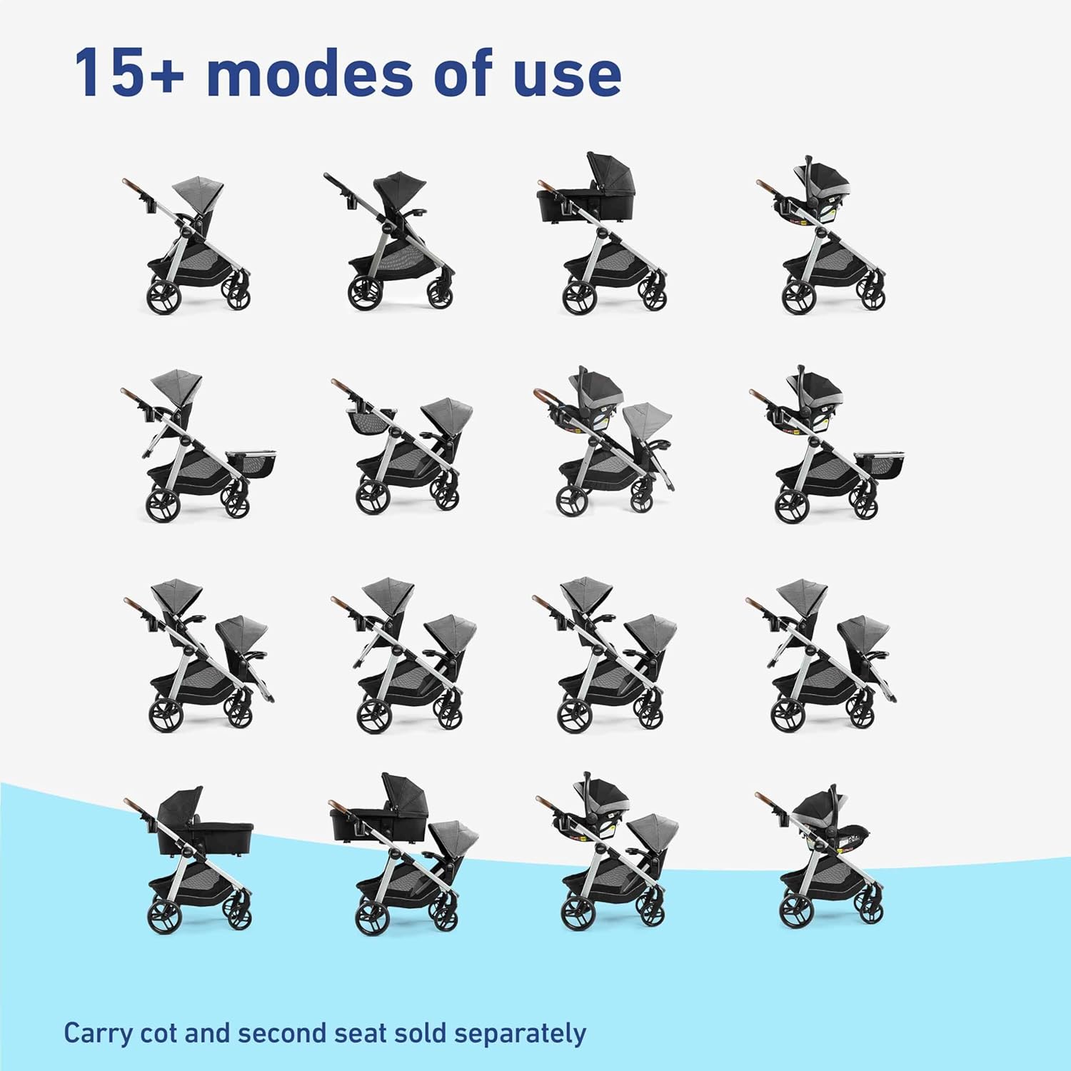 - Over 15 ways to configure the stroller for the versatility you need