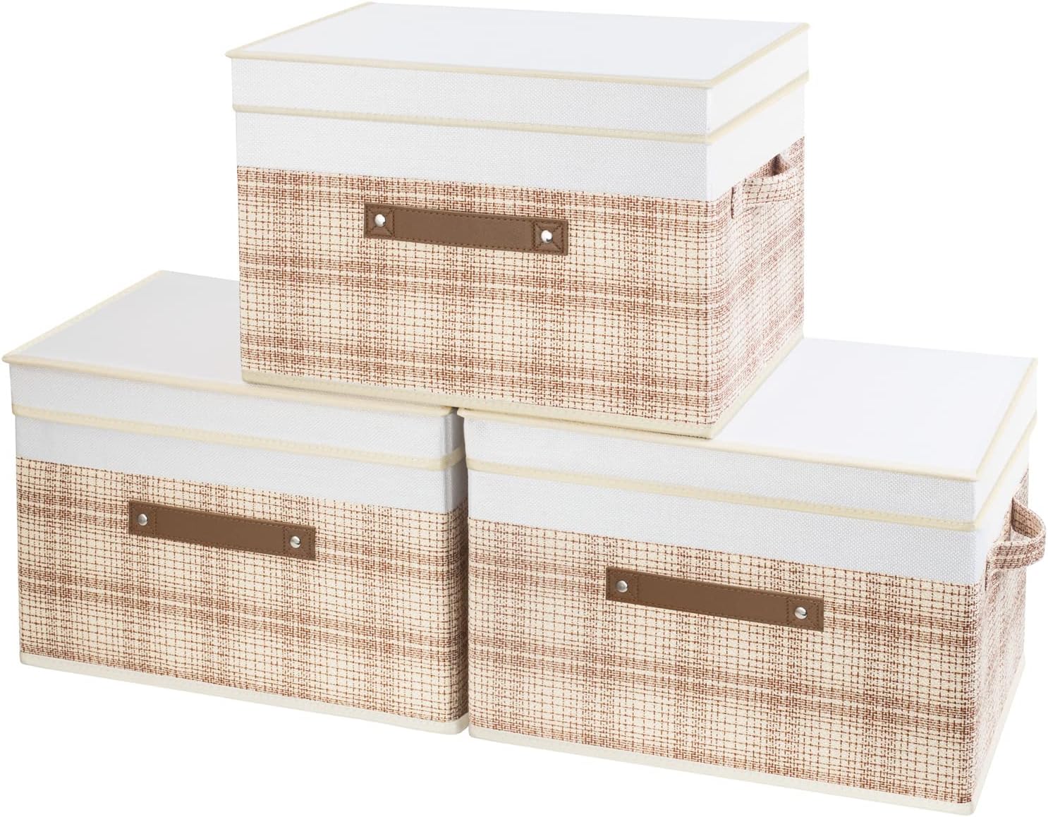 TYEERS Collapsible Storage Bins with Lids, Patchwork Design, Washable, Fabric Storage Boxes, 14.9x9.8x9.8 inches, 3 Pack, Camel Tan