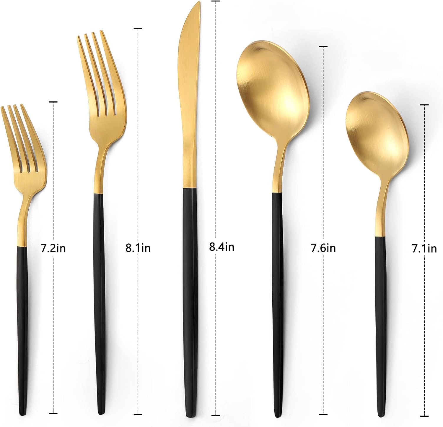 - Service for 8 - This matte gold silverware set can be used by eight people. The set includes : 8 dessert fork, 8 dessert spoons, 8 dinner forks, 8 dinner spoons and 8 dinner knives.Please let us upgrade your tableware to make the dining table more complete and beautiful.