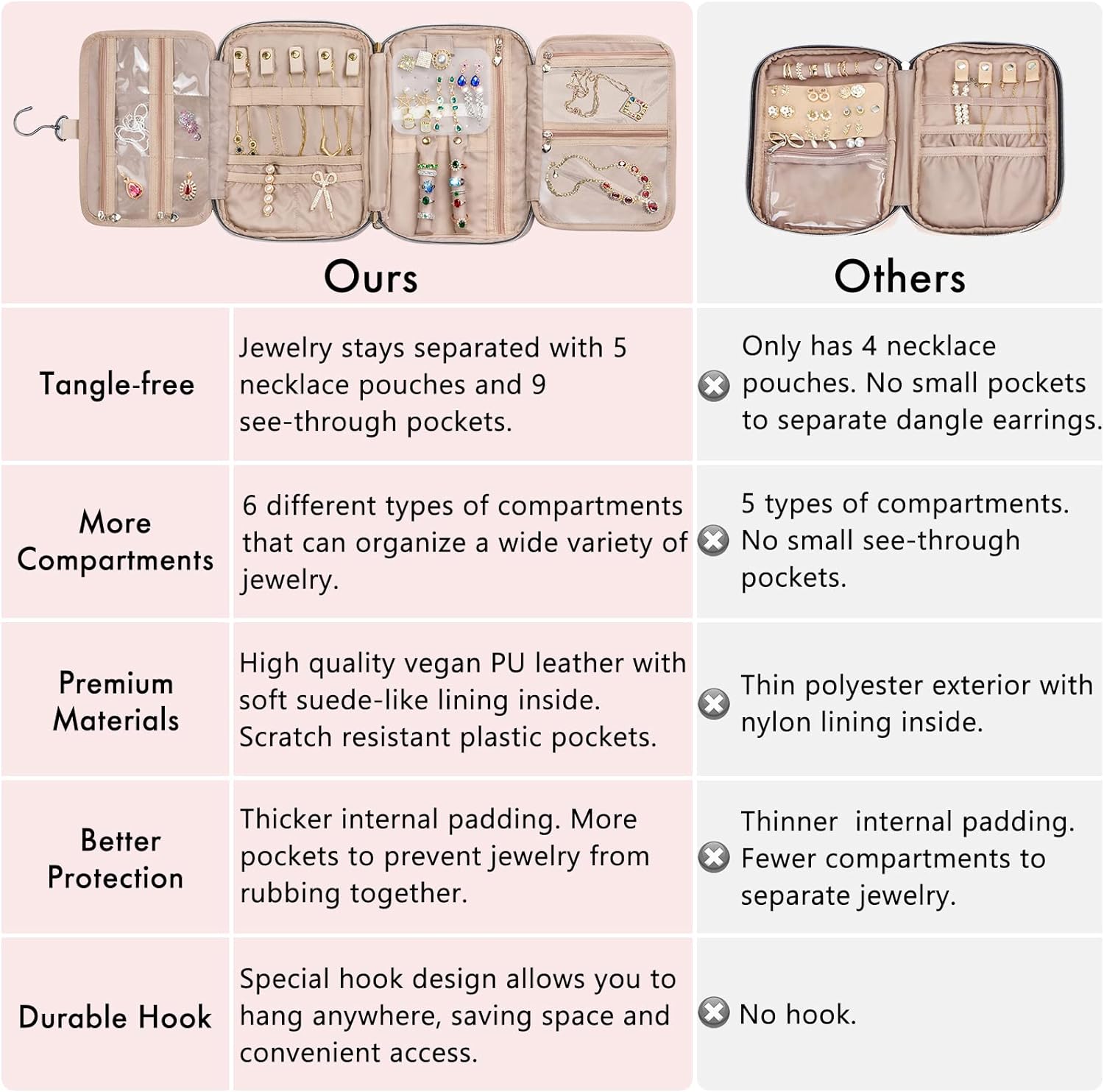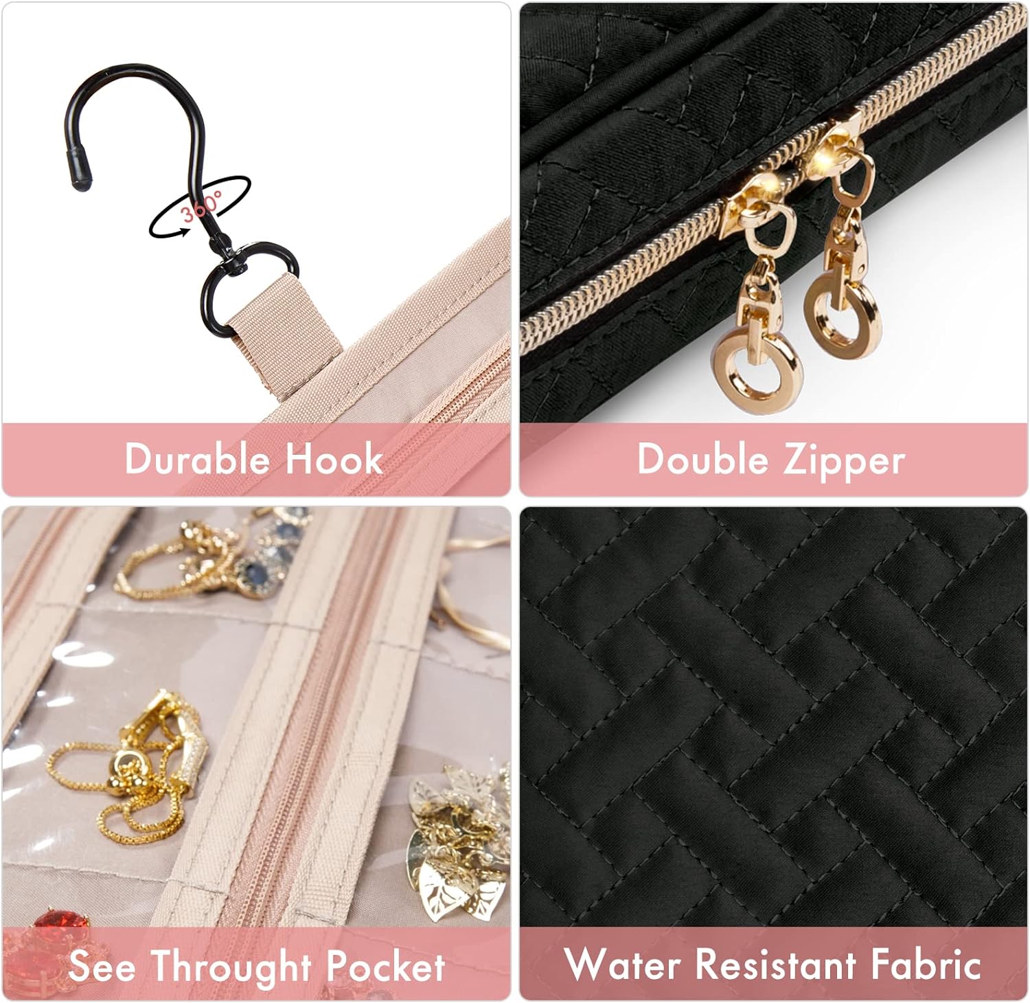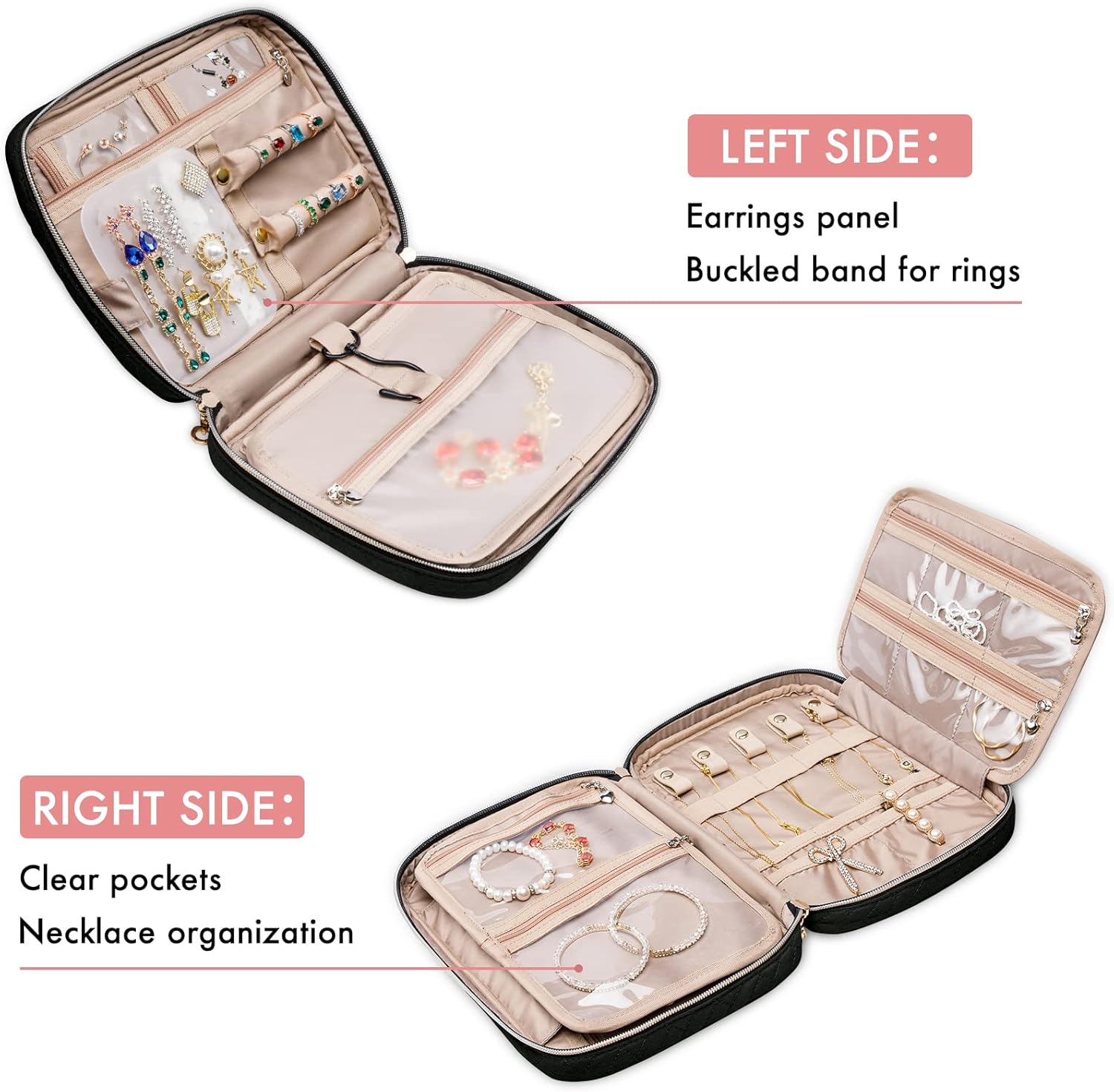 - 【More Compartments】: Buckle band for rings + earrings panel + necklace buckled strap + interlayer zippered pouch + side zippered pocket