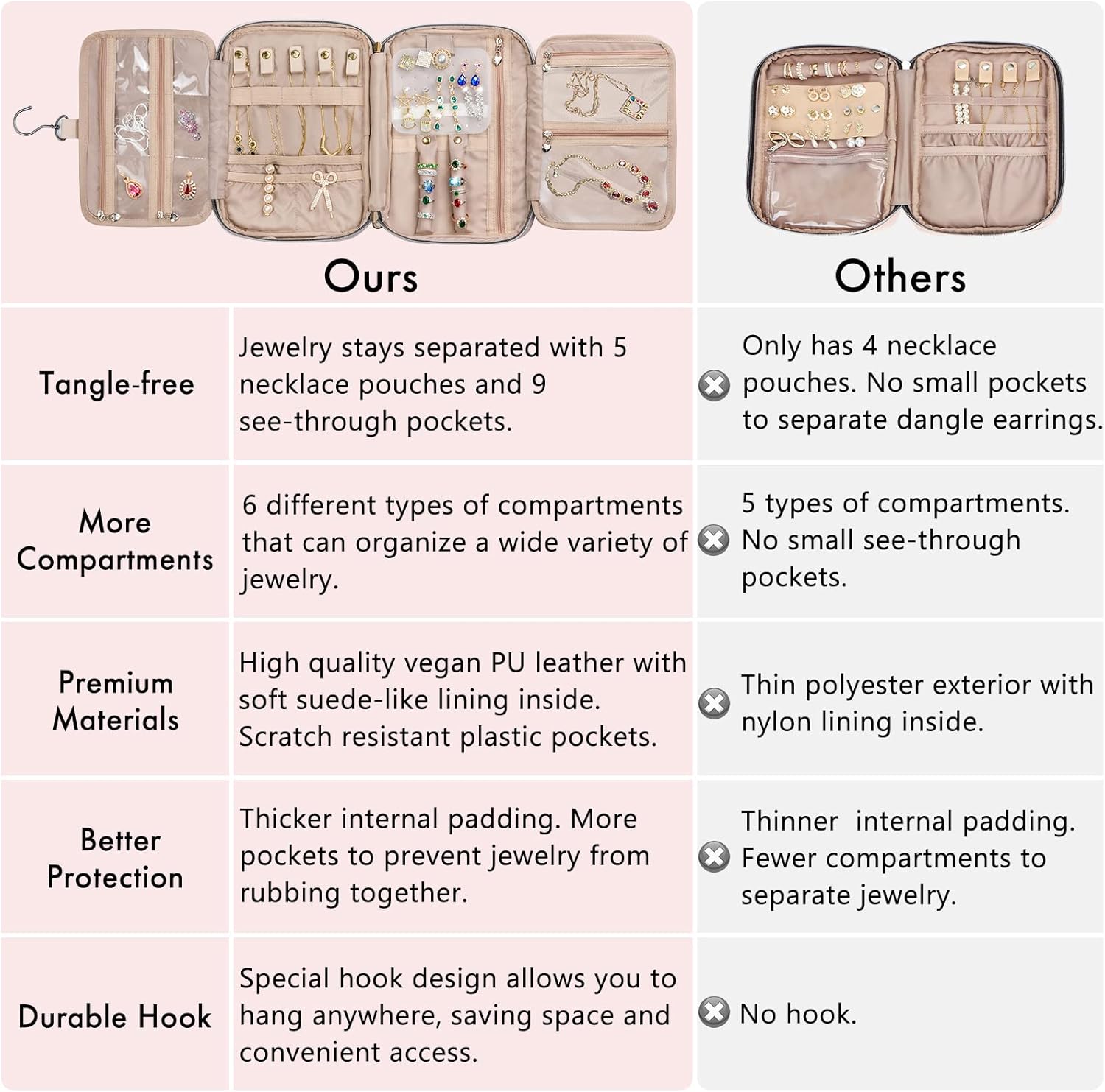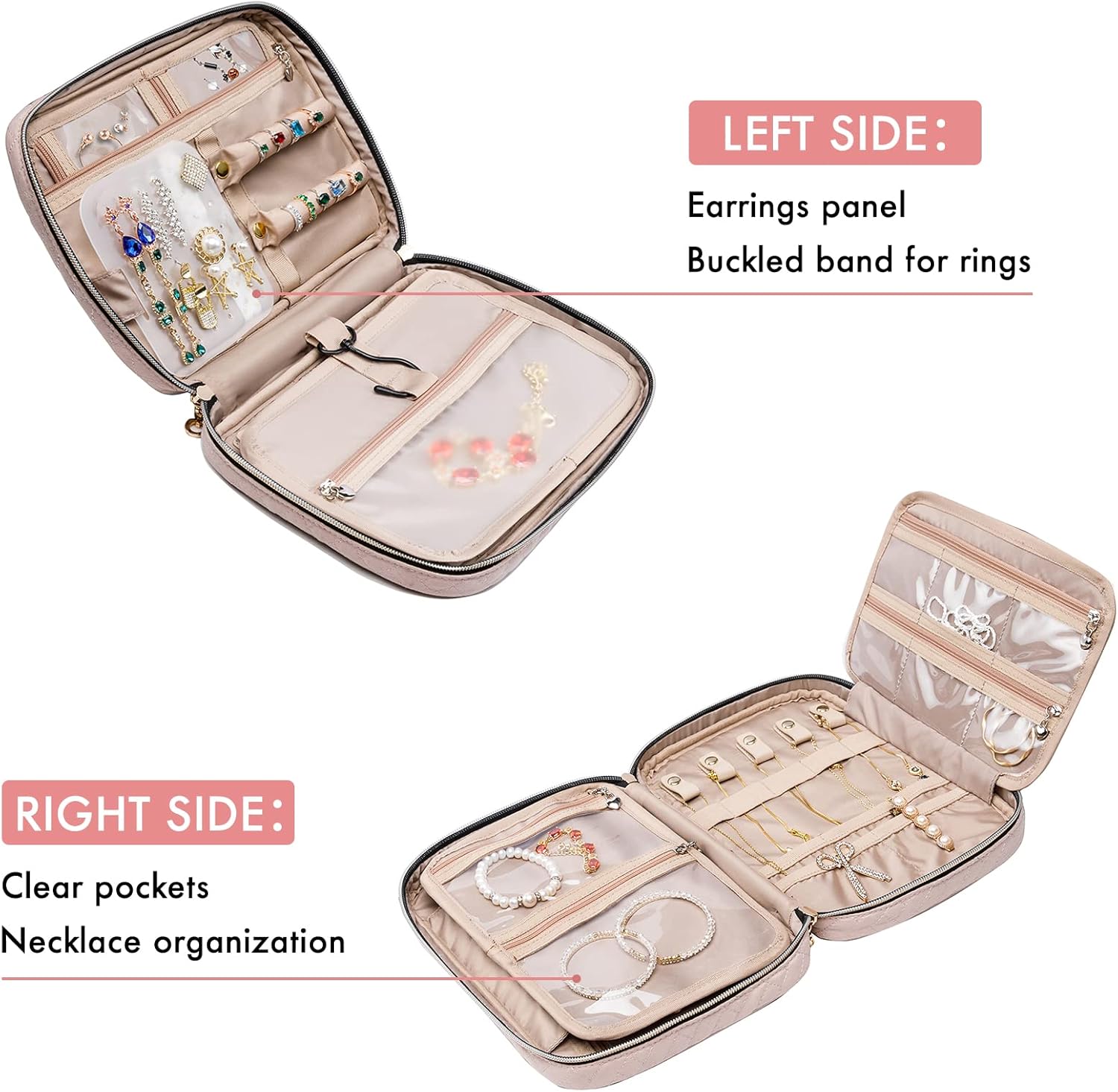 - 【More Compartments】: Buckle band for rings + earrings panel + necklace buckled strap + interlayer zippered pouch + side zippered pocket