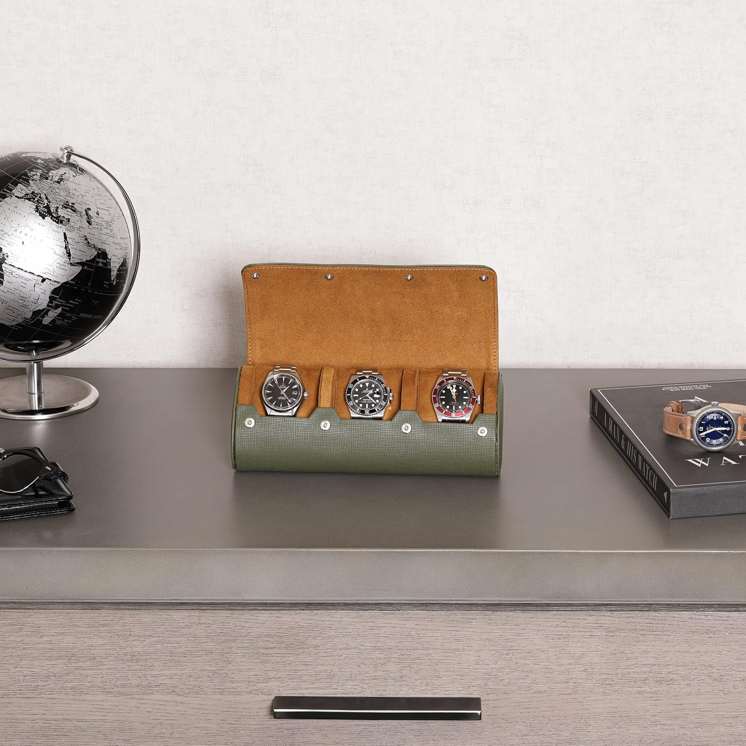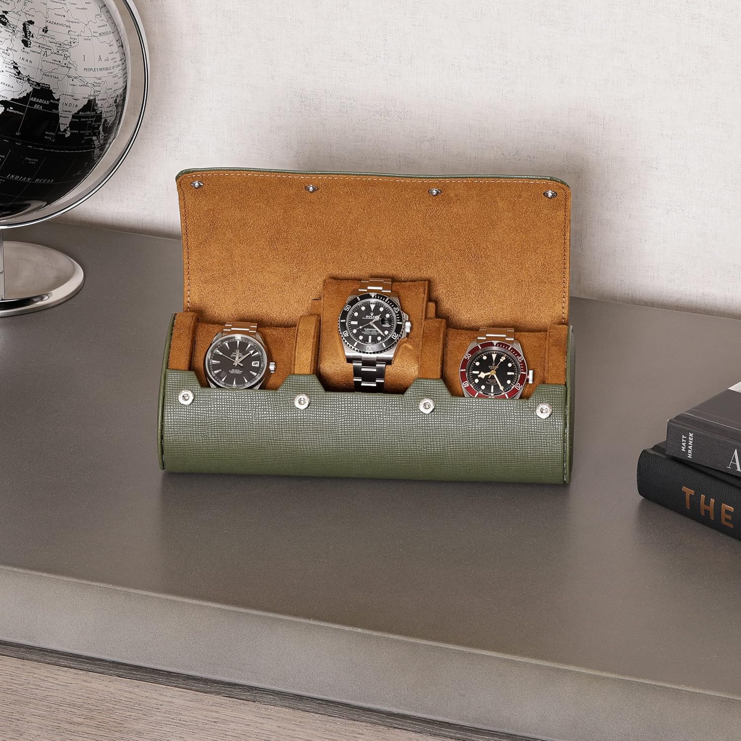 ROTHWELL Watch Roll Travel Case for 3 Watches | Tough Portable Protection, Fits All Wrist Watch & Smart Watches Up to 50mm (Green/Tan)