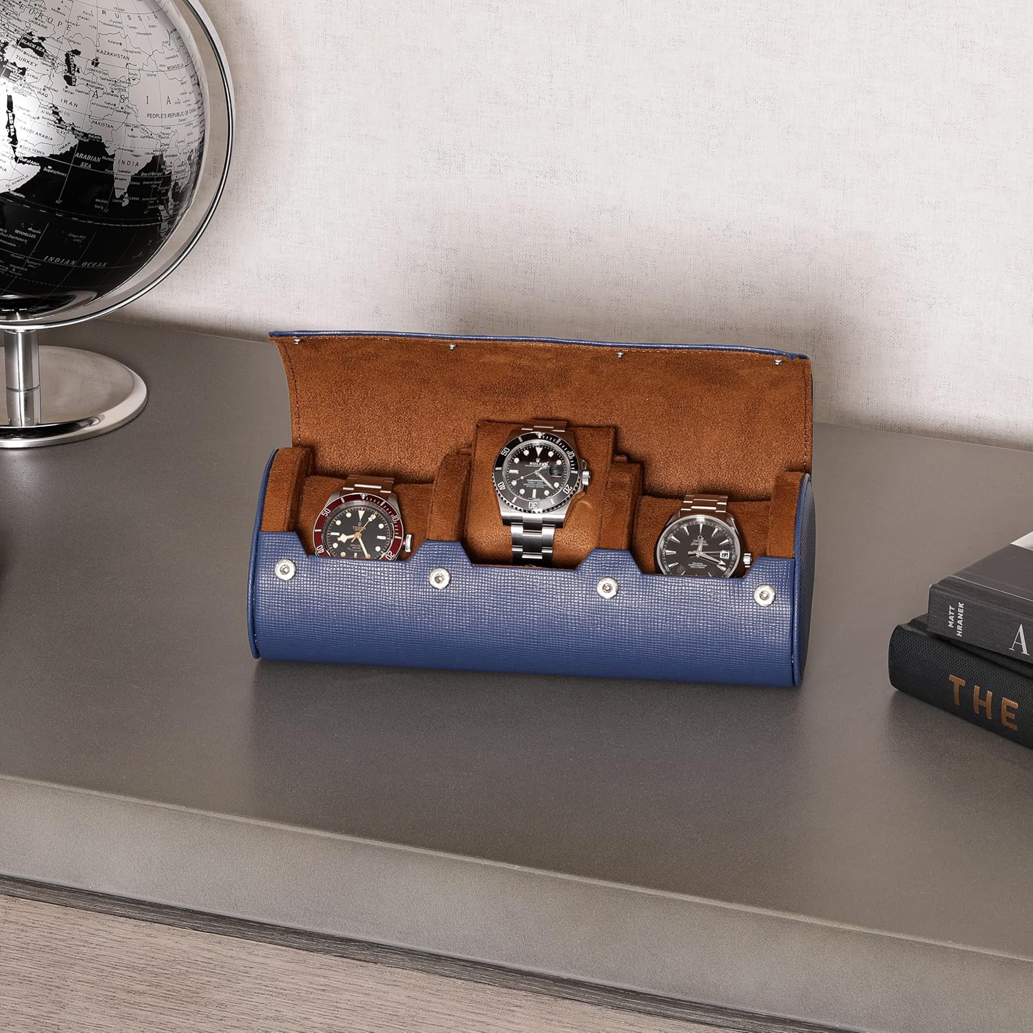 ROTHWELL Watch Roll Travel Case for 3 Watches | Tough Portable Protection, Fits All Wrist Watch & Smart Watches Up to 50mm (Blue/Tan)