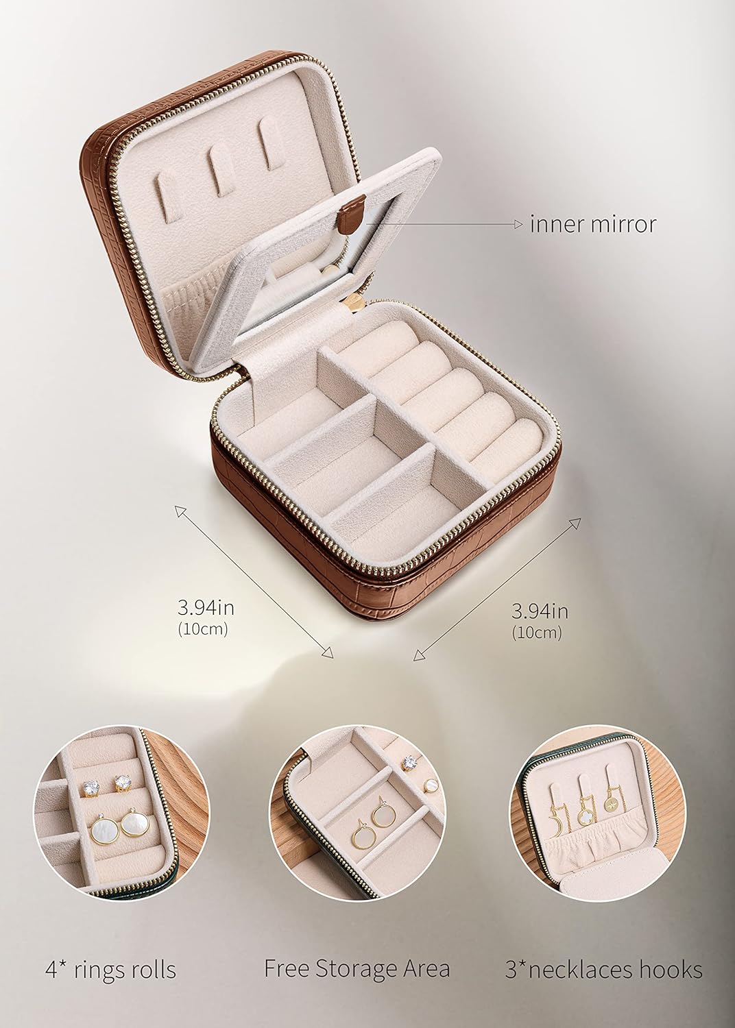 - Right Size for Portable: 3.9" x 3.9" x 2.1”, The travel jewelry organizer is just right size for travel, our jewelry organizer travel is small enough to carry and fit in your luggage or daily hand bag.