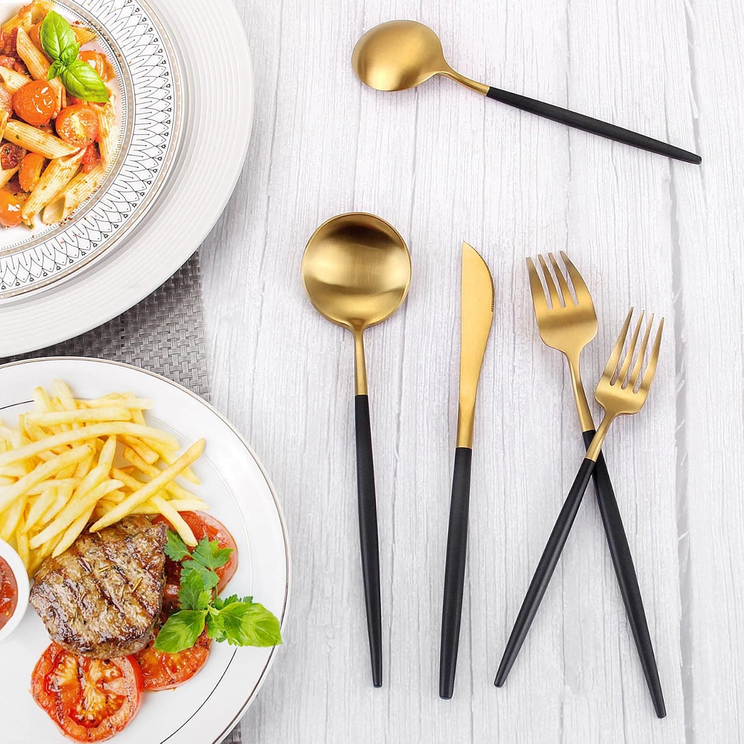 - Gold cutlery set have the unique, stylish looking make it extremely gorgeous in appearance, standing out from ordinary tableware, stainless steel utensils set goes well with any style you already have; Spoons and forks set can match your modern dinnerware set and dish set perfectly, is ideal for family, hotel, kitchen