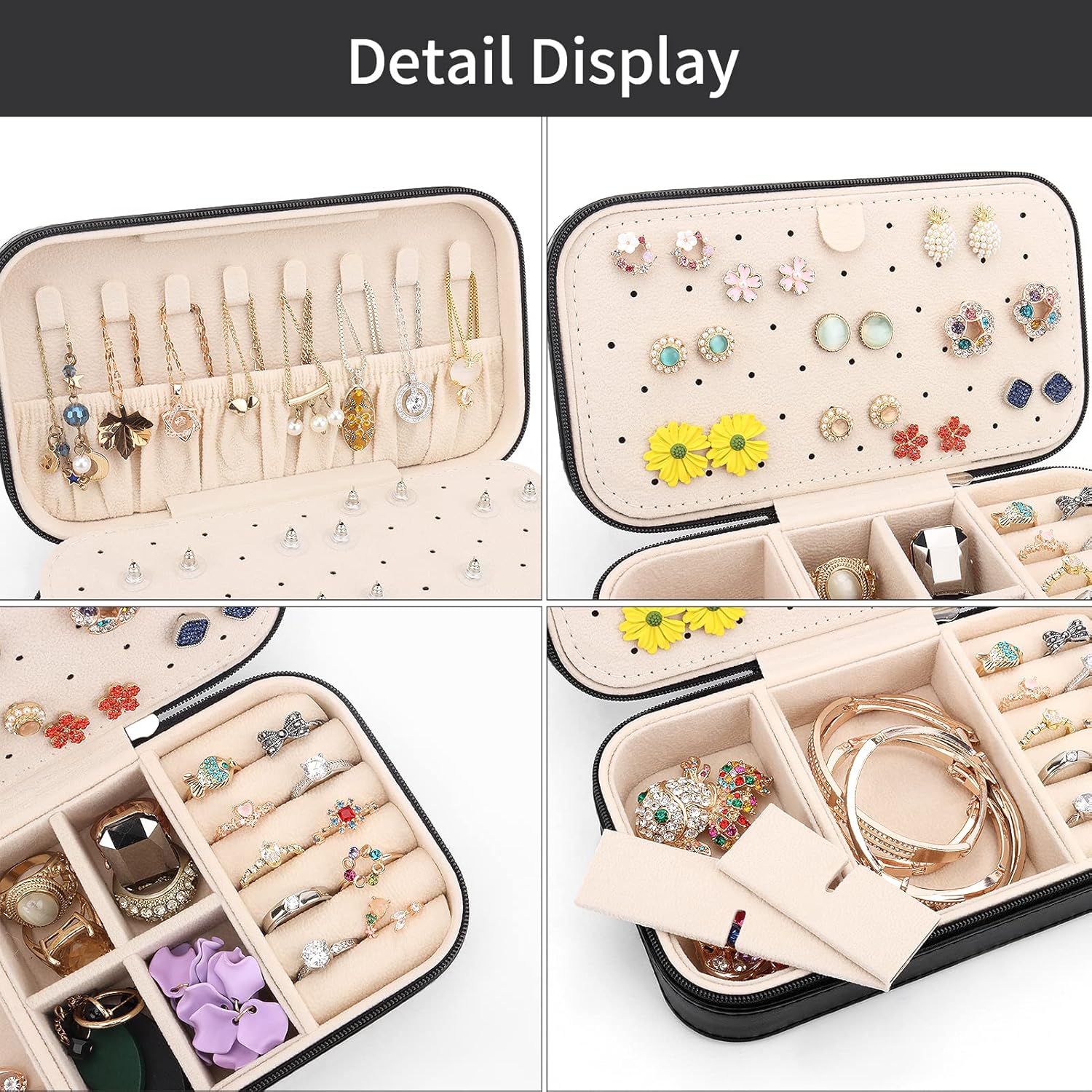 - 🎁【PRACTICAL & DELICATE】Built with smooth zipper and removable divisions, you can adjust the space according to your needs. Portable jewelry box is spacious enough with many different compartments to store your rings, earrings, bracelet, pendant, watches, lipstick, brooches. Jewelry organizers and storage can hold the jewelry and keep necklaces and bracelets from tangling.
