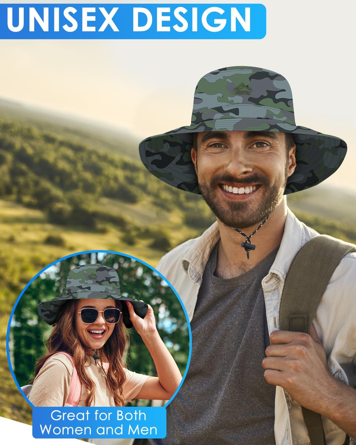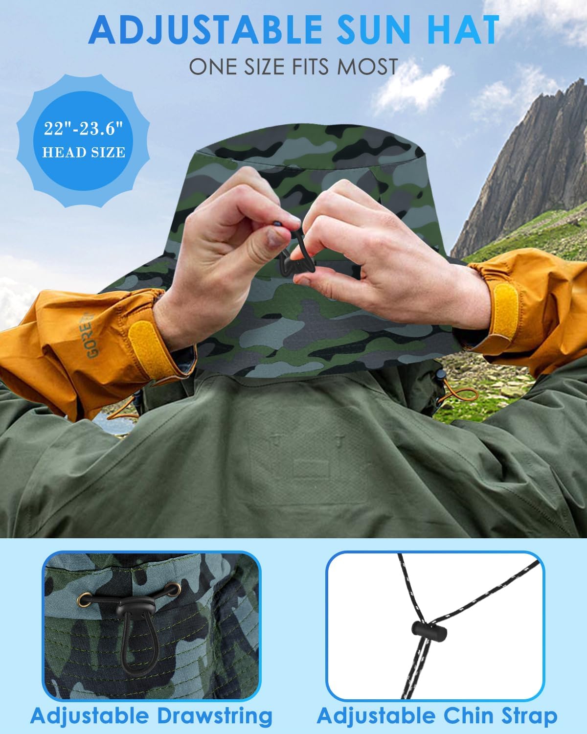 - 👒Adjustable & Unisex fishing hat: Adjustable drawstring design on sun hat rear, which you can adjust it according to your head circumference. One size 22"-23.6" fits most women and men head circumference. Equipped with a detachable and adjustable chin strap to hold your hat in place on windy days