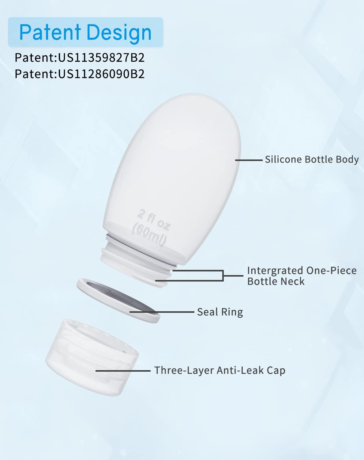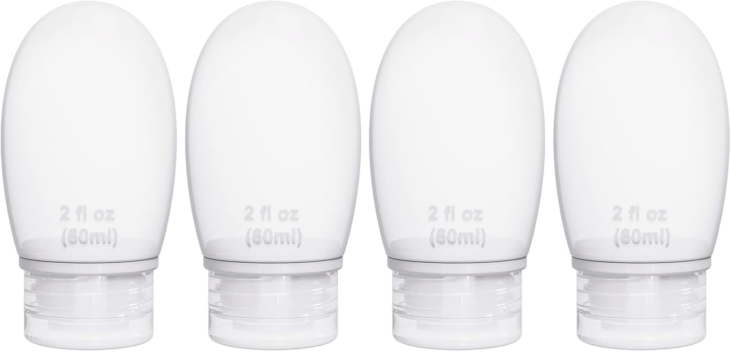- TSA Approved Silicone Travel Bottles: 4 Pieces 2 OZ Silicone Travel Bottles which are made of top grade silicone and leak proof.