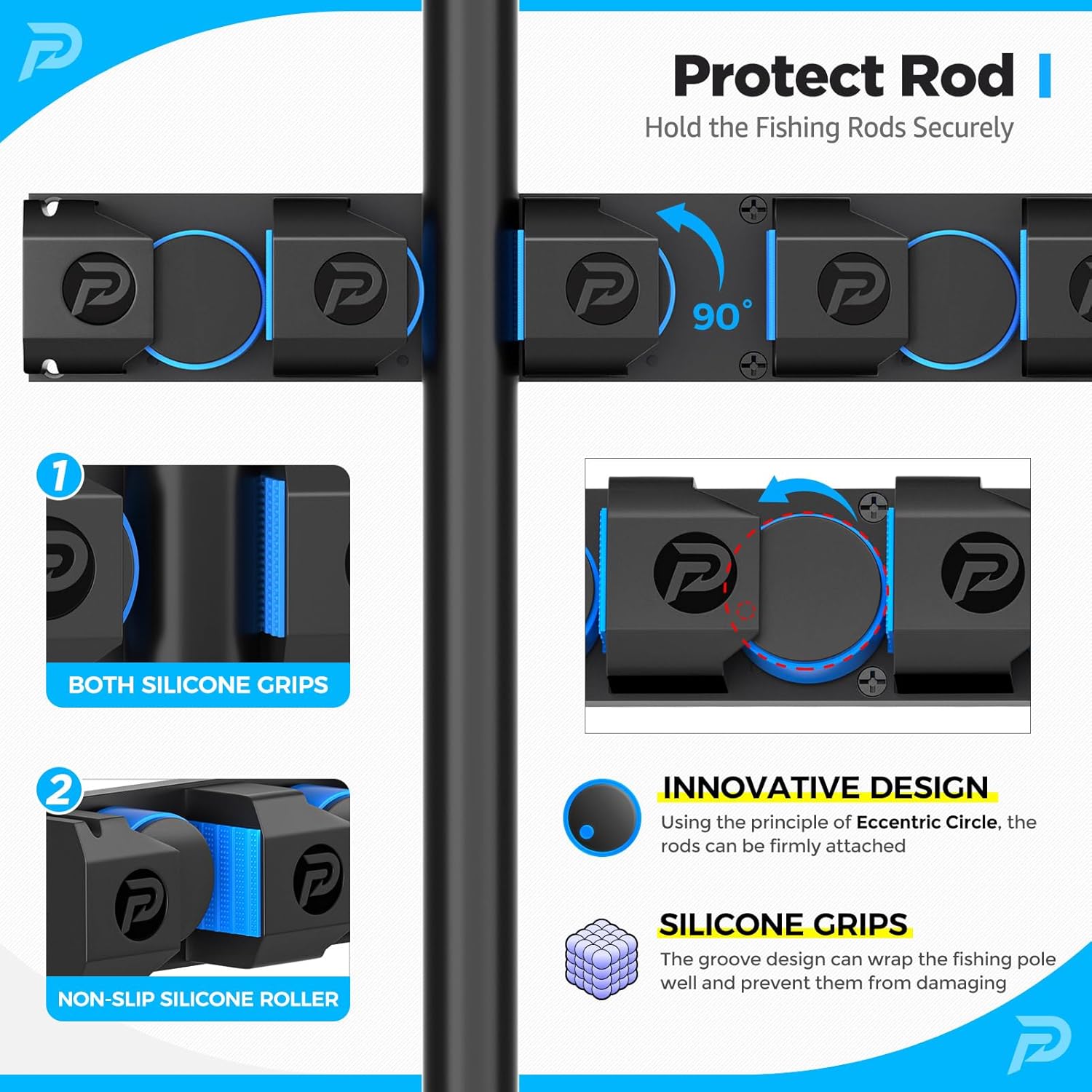 - 【SECURE YOUR FISHING RODS】- The fishing pole rack features a double-side thickened silicone grip design, providing the safest and most reliable protection for all your fishing rods! The thickened silicone and Non-slip Silicone Roller ensure rods can hold securely in your rod holders preventing rods from sliding down or damaging. After hundreds of adjustments and upgrading, the spring grip is moderate, so you don't have to worry about getting too much power to harm your expensive fishing rod.