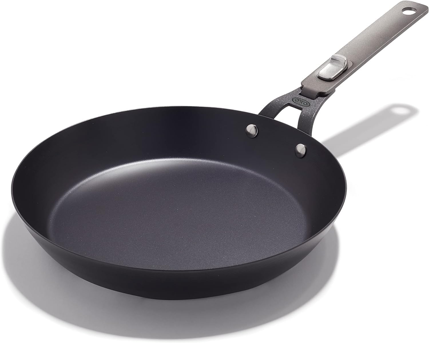 OXO Outdoor Pre-Seasoned Carbon Steel 10" Frying Pan Skillet, Detachable Handle for Easy Storage, Indoor Use, Nonstick with Use, Induction Suitable,Oven & Broiler Safe,Browning, Grill,Sear,Saute,Black