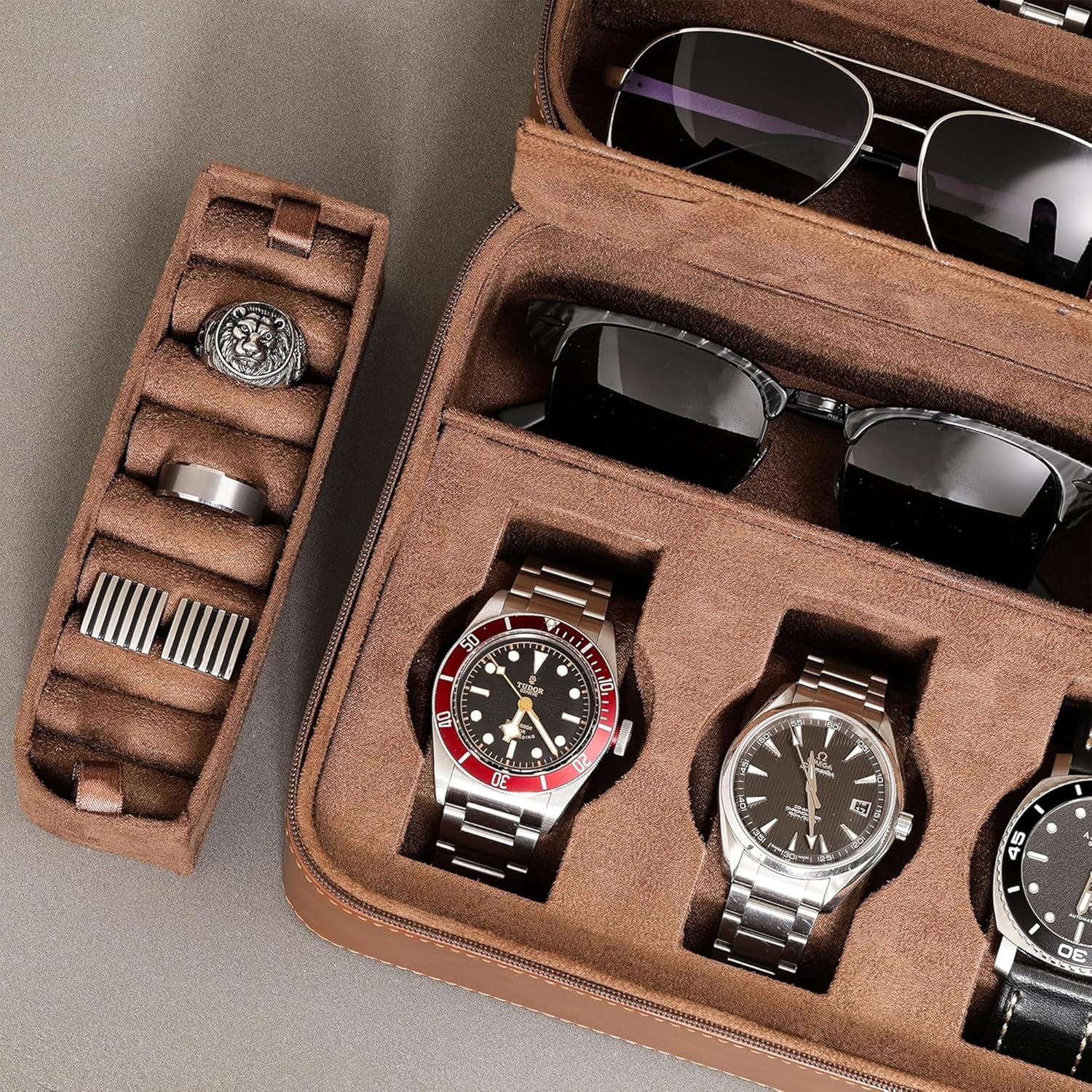 - RING /CUFFLINK/ SUNGLASSES STORAGE: With a removable holder featured on the lid, you can keep your rings and cufflinks organized and easily accessible. And when you need to store your sunglasses, simply remove the holder to create space for two pairs of sunglasses. This versatile storage option is perfect for keeping your accessories organized and easily accessible.