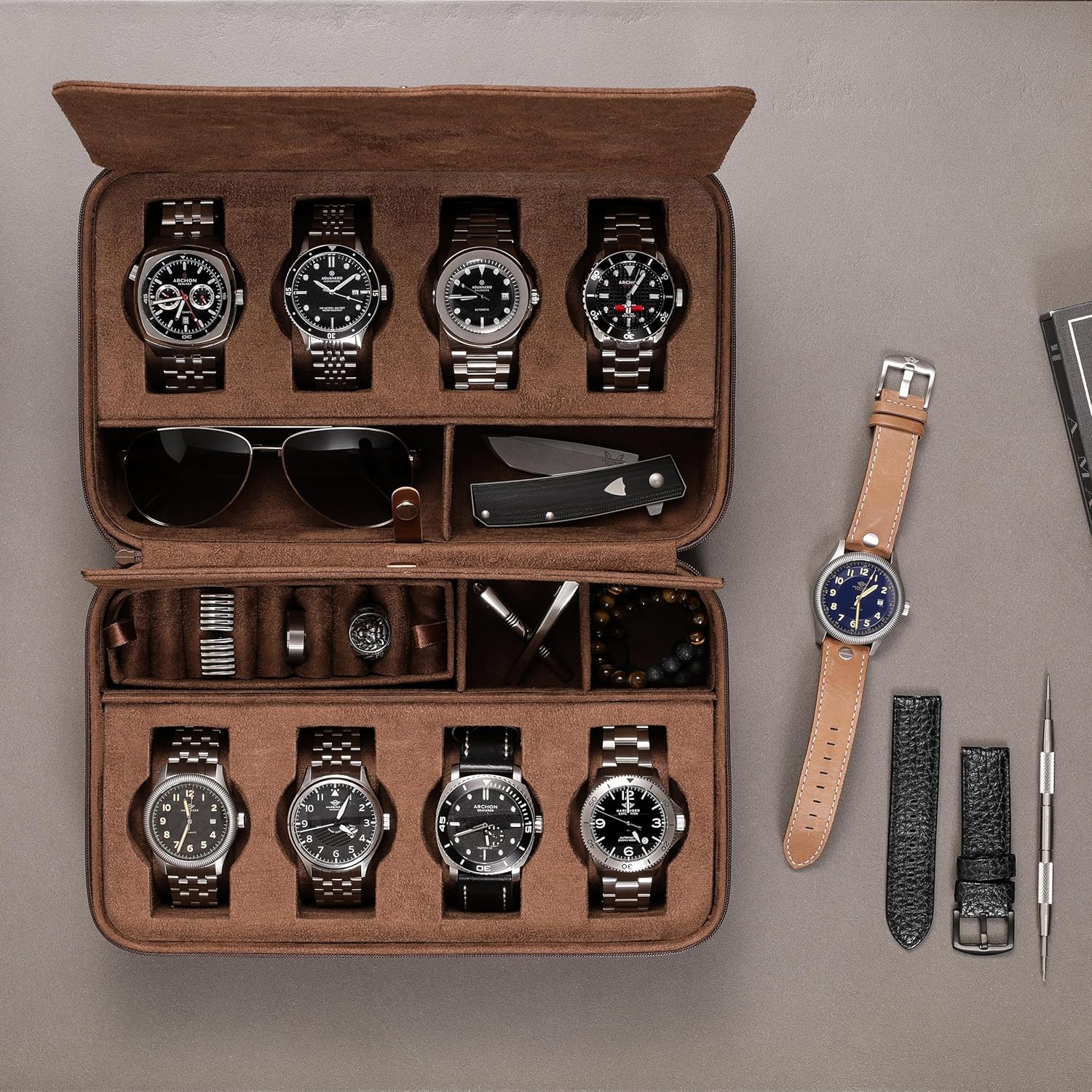 - PERFECT TRAVEL ACCESSORY: Lightweight and perfect for vacation getaways, work travel or just storing your valuable watches and accessories. With ample space to accommodate up to 8 watches, along with 2 pairs of sunglasses or your favorite rings and cufflinks, you'll have everything you need safely and securely organized.