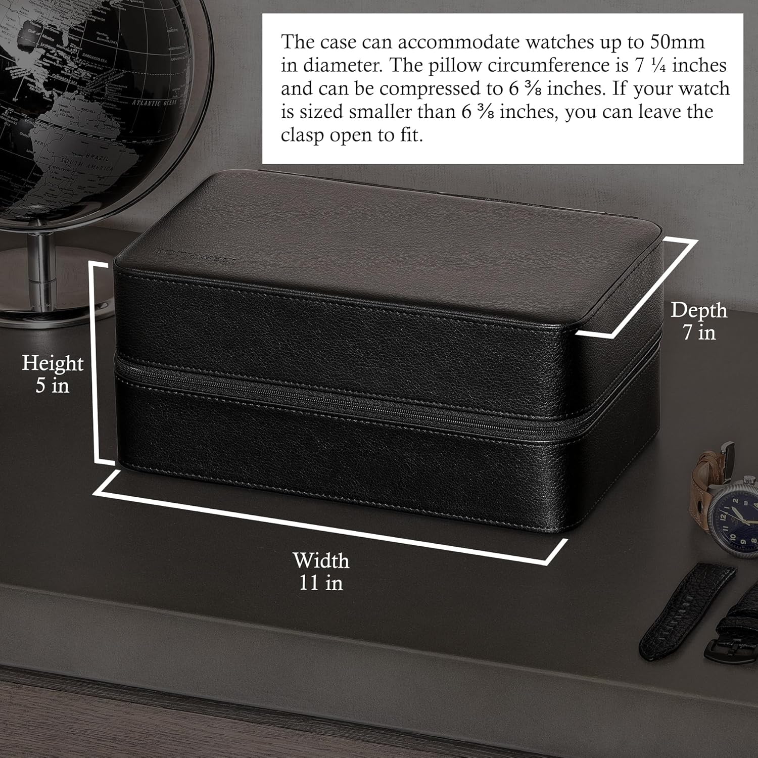 - FITS ANY STYLE: This 8 slot watch travel case will fit any men’s or women’s watches, smart watch, fitness tracker, or luxury watch with a face less than 55mm, fits all brands and styles. Pillow circumference is 7.25 inches and compressible to 6.125 inches. If your watch is sized to be smaller than 6.125 inches you can leave the clasp open to fit.
