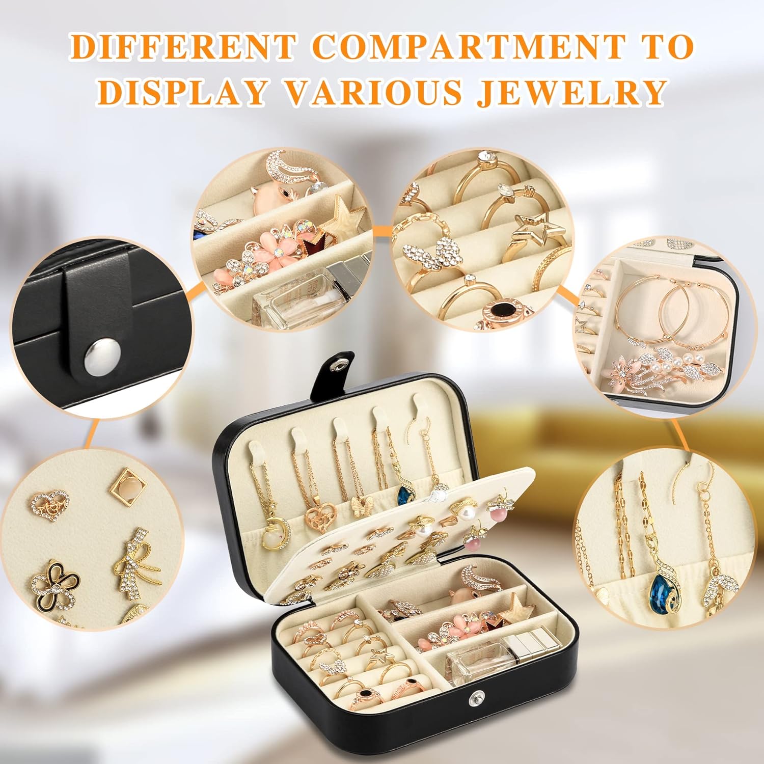- 【Portability】Mini jewelry box size: L*W*H, (6.2in*4.3in*1.9in). As a small travel jewelry box, it is large enough to store jewelry, yet compact in size, saving space and easy to carry. It can be easily placed in a handbag or suitcase, keeping your jewelry organized and tidy..